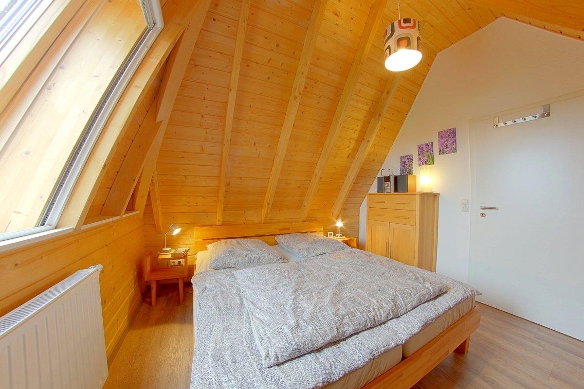 Das erste Schlafzimmer im Obergeschoss verfügt ebenfalls über ein massives Buchenholzbett (180 x 200 cm), 5-Reflex-Zonen-Lattenroste und Matratzen sowie zwei Nachtschränke mit ausreichend Beleuchtung. Ein Korbsessel und ein kleiner Tisch runden das Bild ab. In diesem Raum ist auch noch Platz für das Reisekinderbett