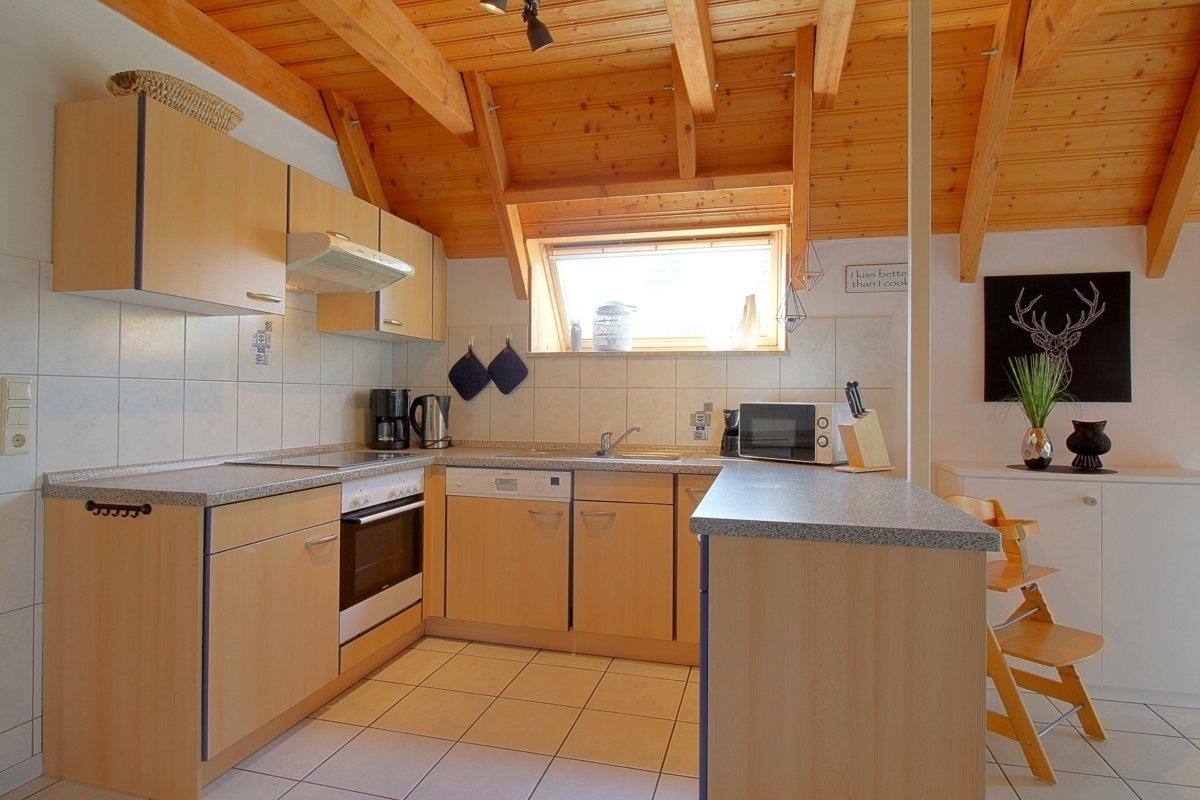 Im mit Vinyloböden ausgestatteten Erdgeschoss dieses Hauses befindet sich die offene Küche mit Kaffeemaschine, Geschirrspüler,
