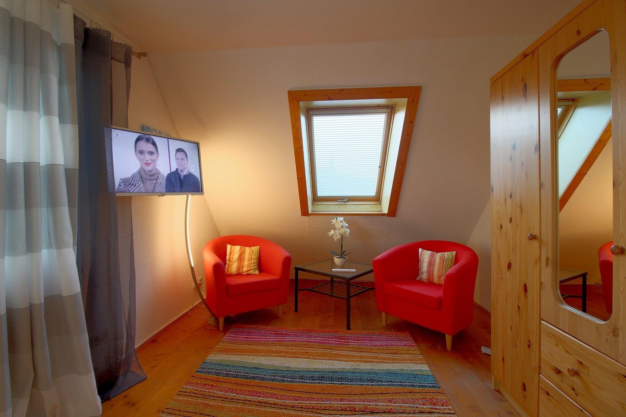 Ein gemütliches Wohnzimmer mit Holzdielenboden, Schlafsofa und TV, ein geräumiges Schlafzimmer mit Boxspringbett ( 1,80x2,00 ), TV und 2 Sesseln, eine komplett eingerichtete Einbauküche mit Geschirrspüler und Essbereich, und ein Vollbad mit Fenster stehen Ihnen zur Verfügung.