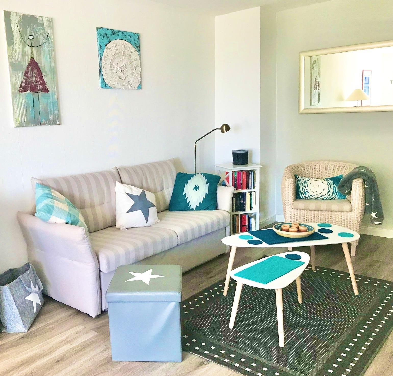 Im Erdgeschoss befindet sich die Einbauküche und der Wohn-/Essbereich mit Schlafsofa.