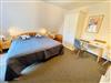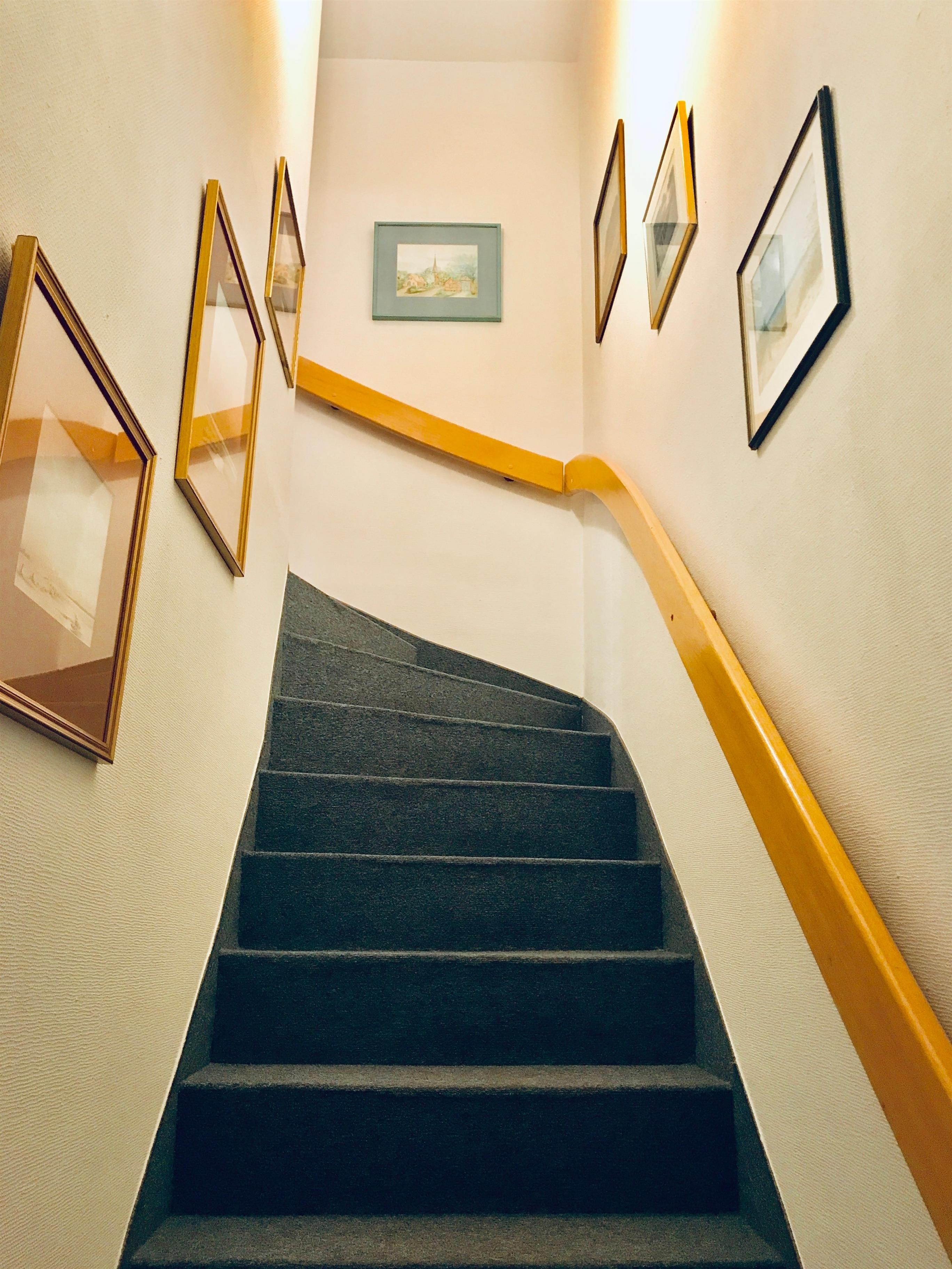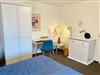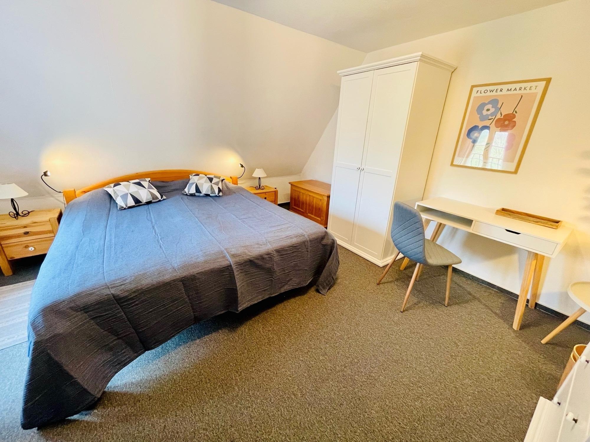 Im Obergeschoss gelangen Sie in den Schlafbereich mit einem 2 Meter breiten Doppelbett und einem kleinen Schreibtisch, sowie ins Duschbad.