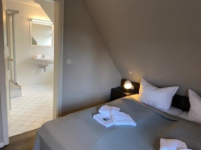 1x Doppelbett mit eigenem Zugang zum Duschbad und WC; 1x mit 2 Einzelbetten. Hier gelangen Sie zum zweiten Bad mit Dusche/WC.