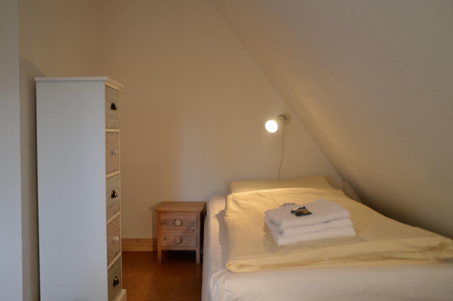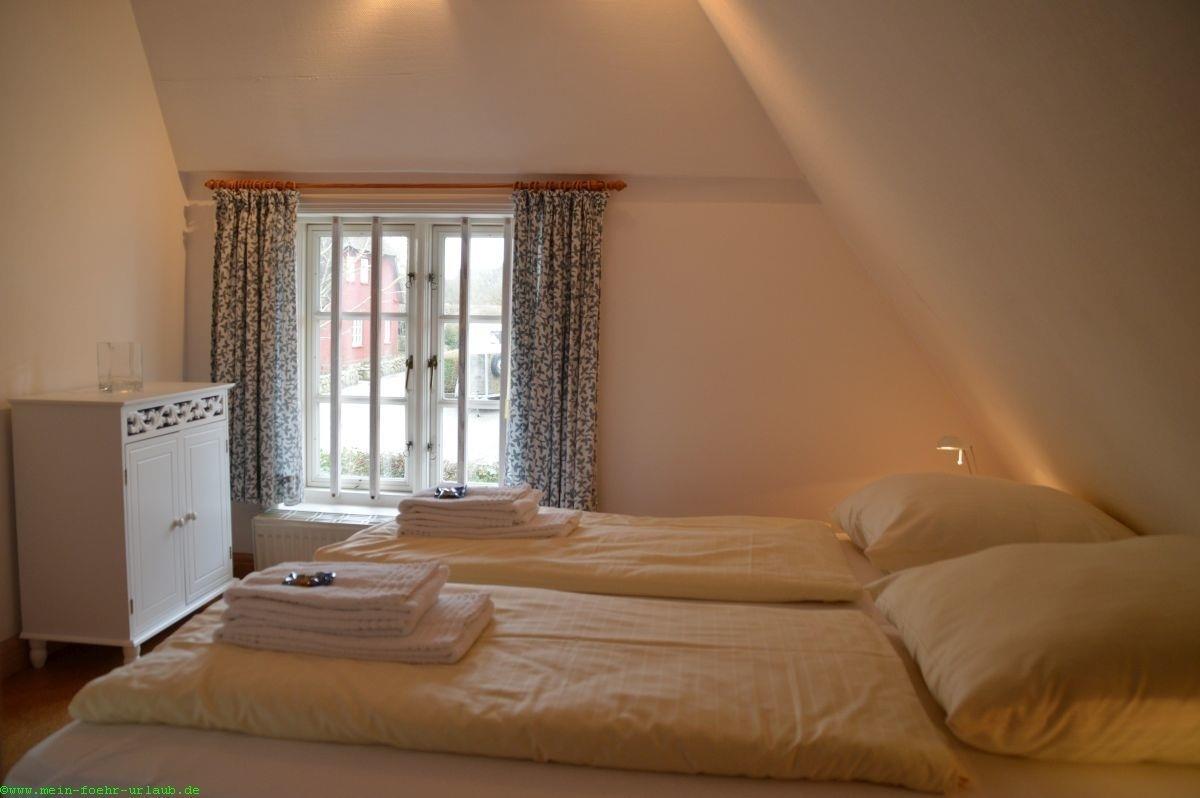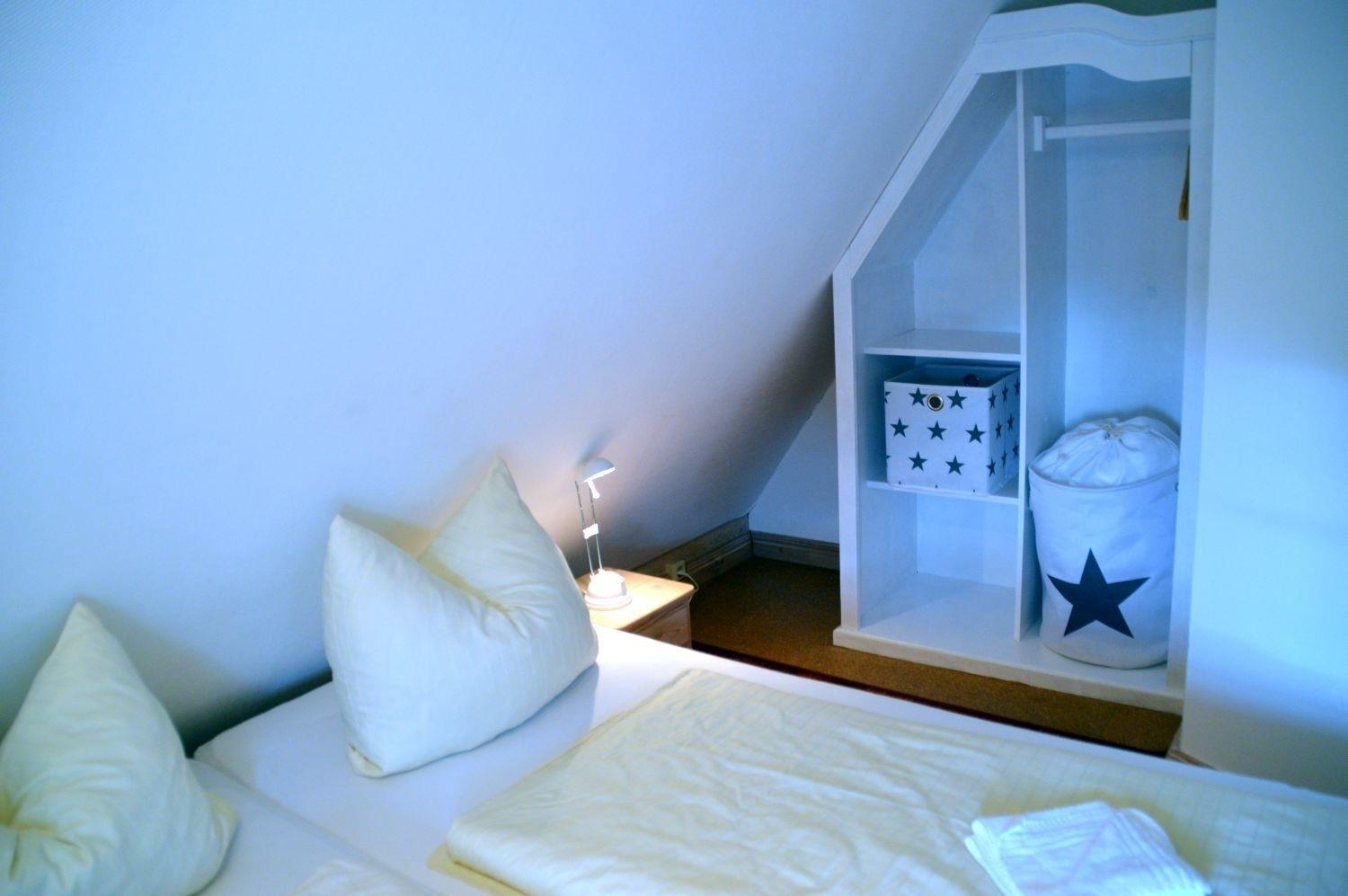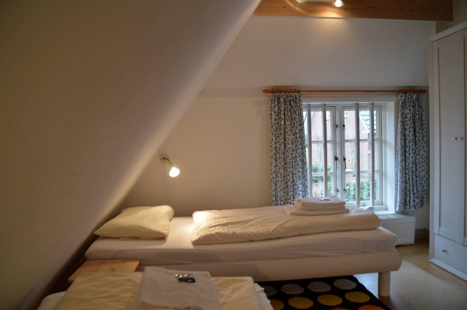 Die Wohnung "Bi de ual Möhl" befindet sich an der Stirnseite des Hauses und ist mit einem separaten Eingang sowie und einer separaten Südterrasse mit Strandkorb ausgestattet. Im Dachgeschoss befinden sich zwei kleine Schlafzimmer mit Doppelbett und zwei Einzelbetten.