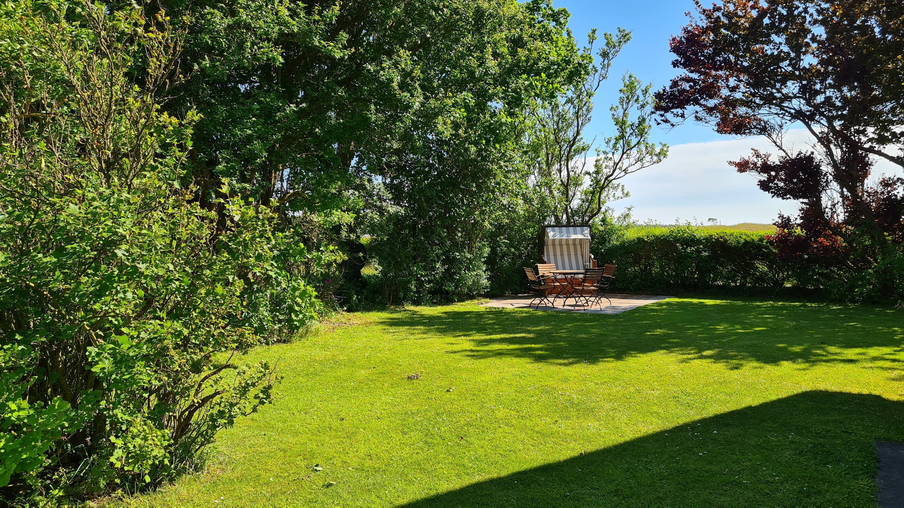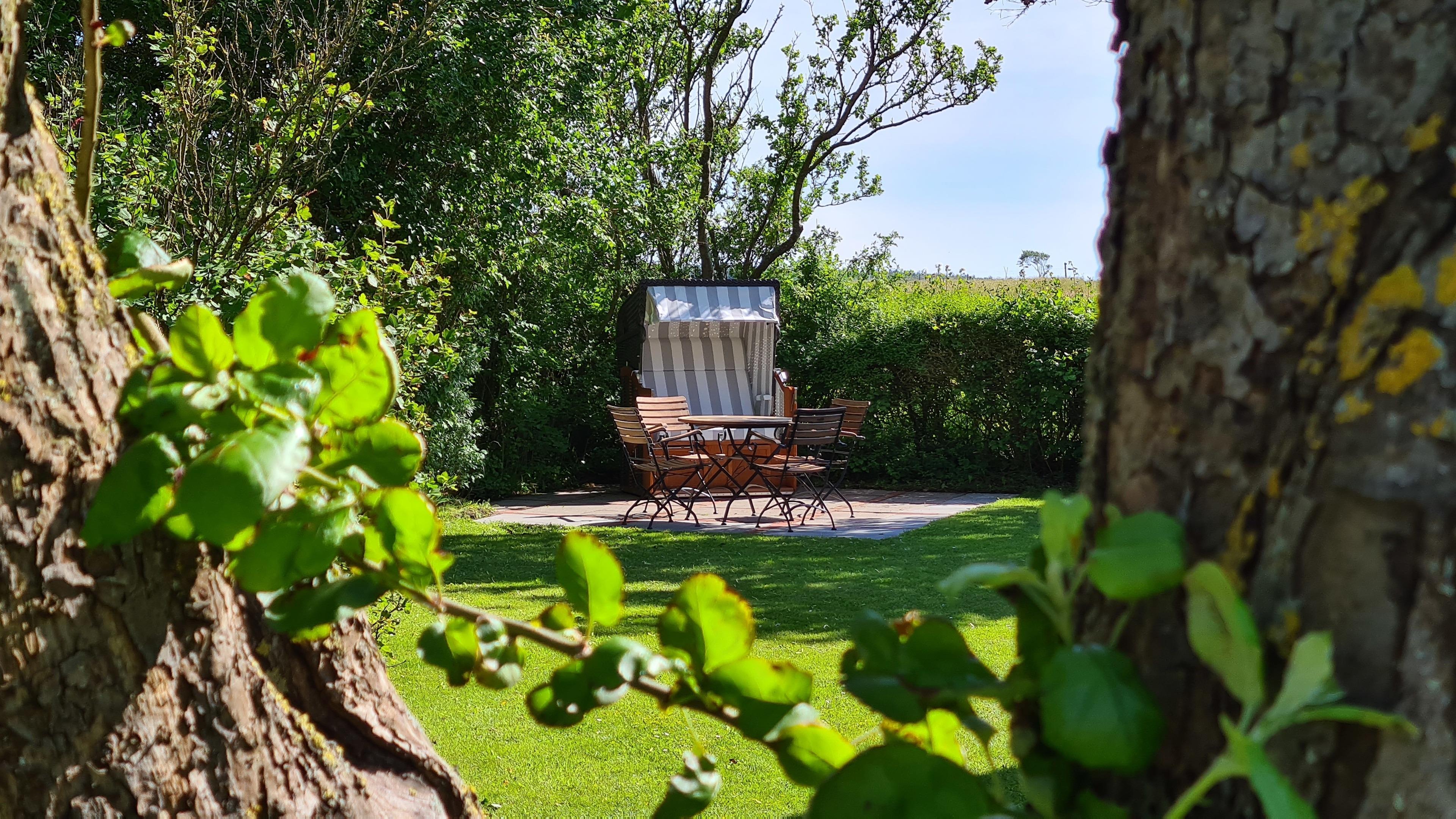 Außerdem gehört zu der Ferienwohnung im großzügigen Garten eine eigene Terrasse mit Gartenmöbeln und einem schönen Strandkorb.