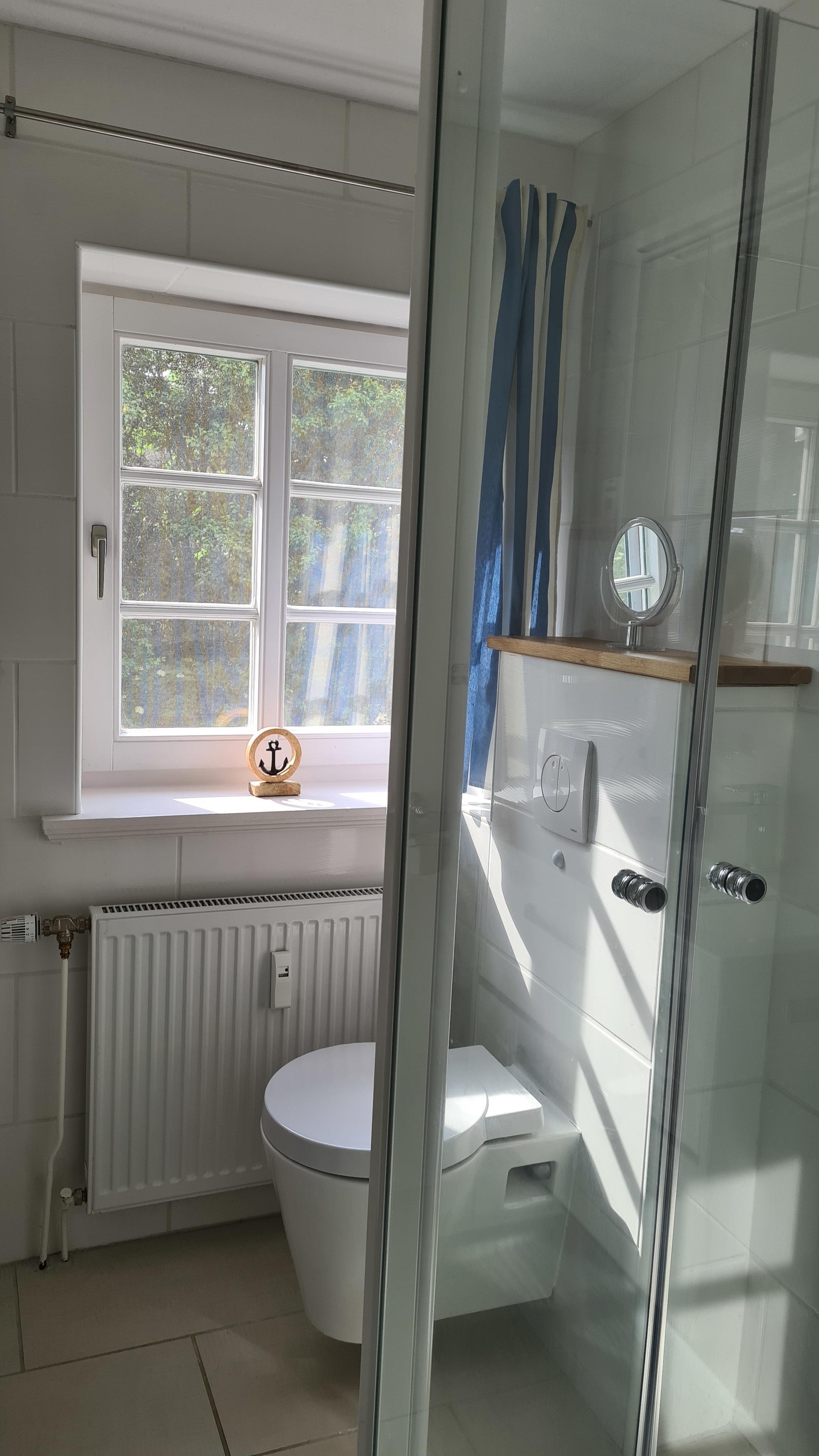 Das Duschbad mit Fenster ist mit einer Regendusche ausgestattet.