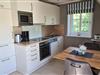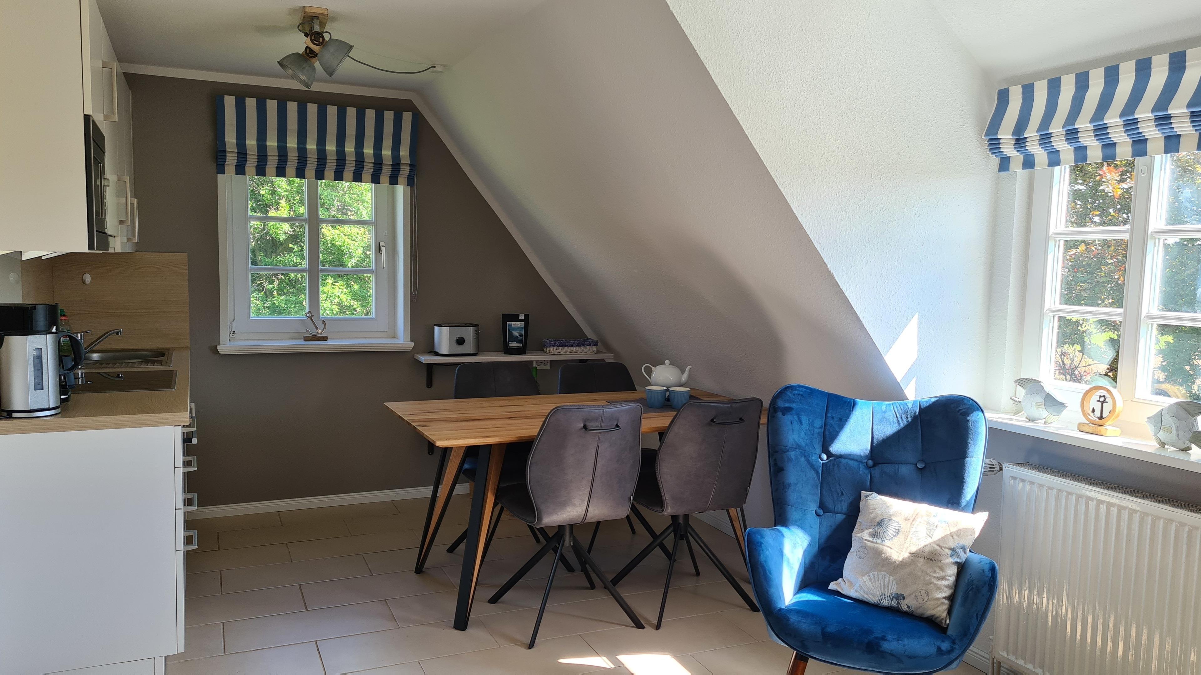 Zudem erreichen Sie den modernen Wohn-/Essbereich mit integrierter heller Küchenzeile. Es stehen Ihnen neben dem Herd auch ein Kühlschrank mit kleinem Gefrierfach, einer Mikrowelle, Kaffeemaschine, Toaster, Wasserkocher und sämtliches Geschirr und Küchenutensilien zur Verfügung.