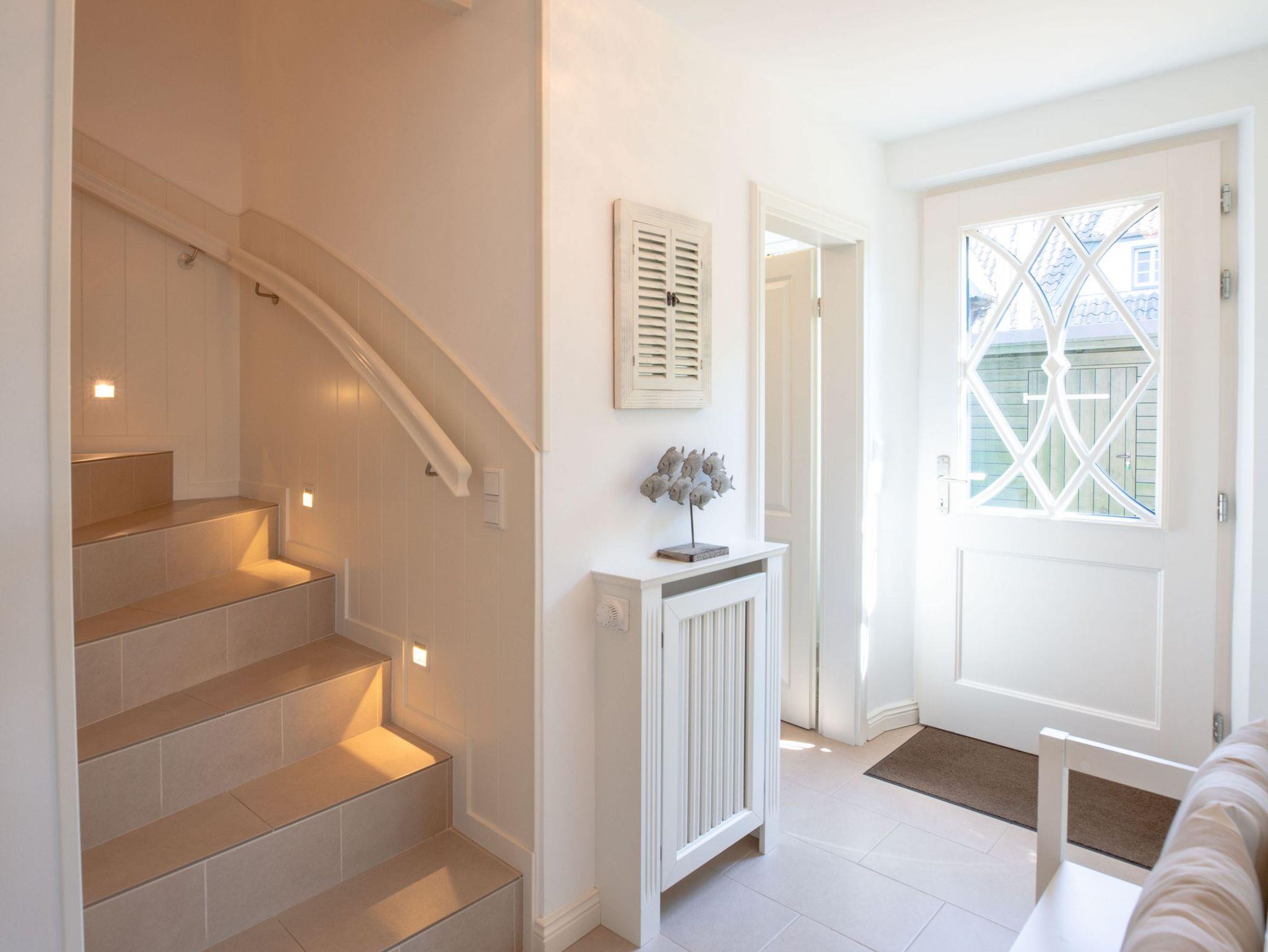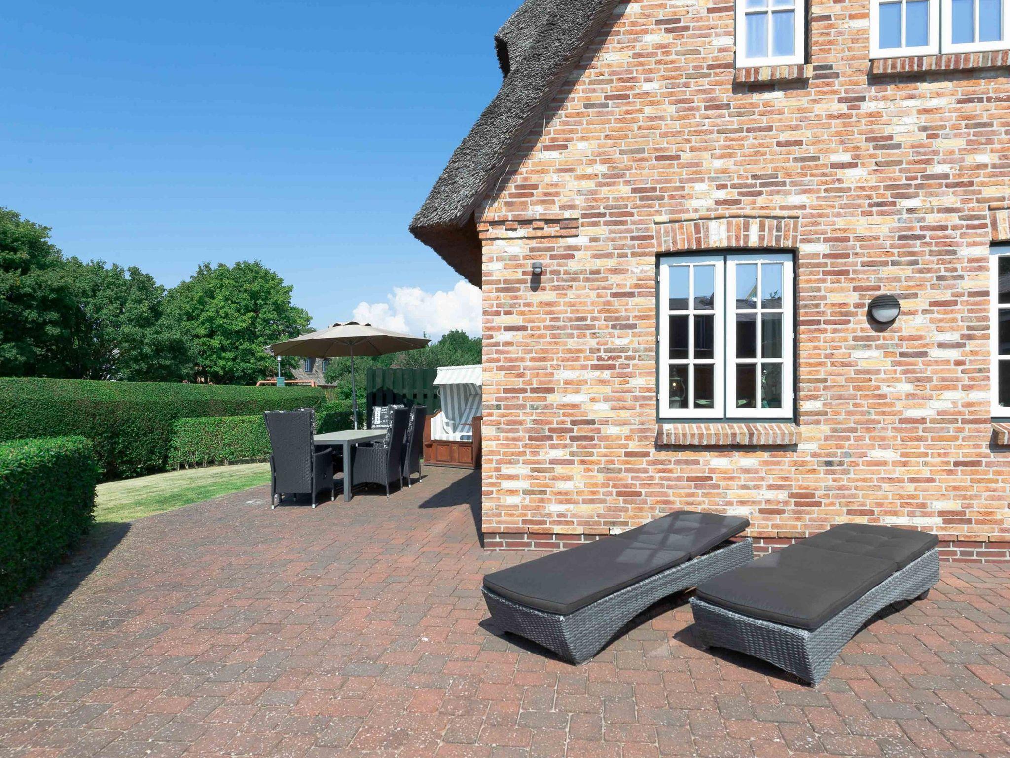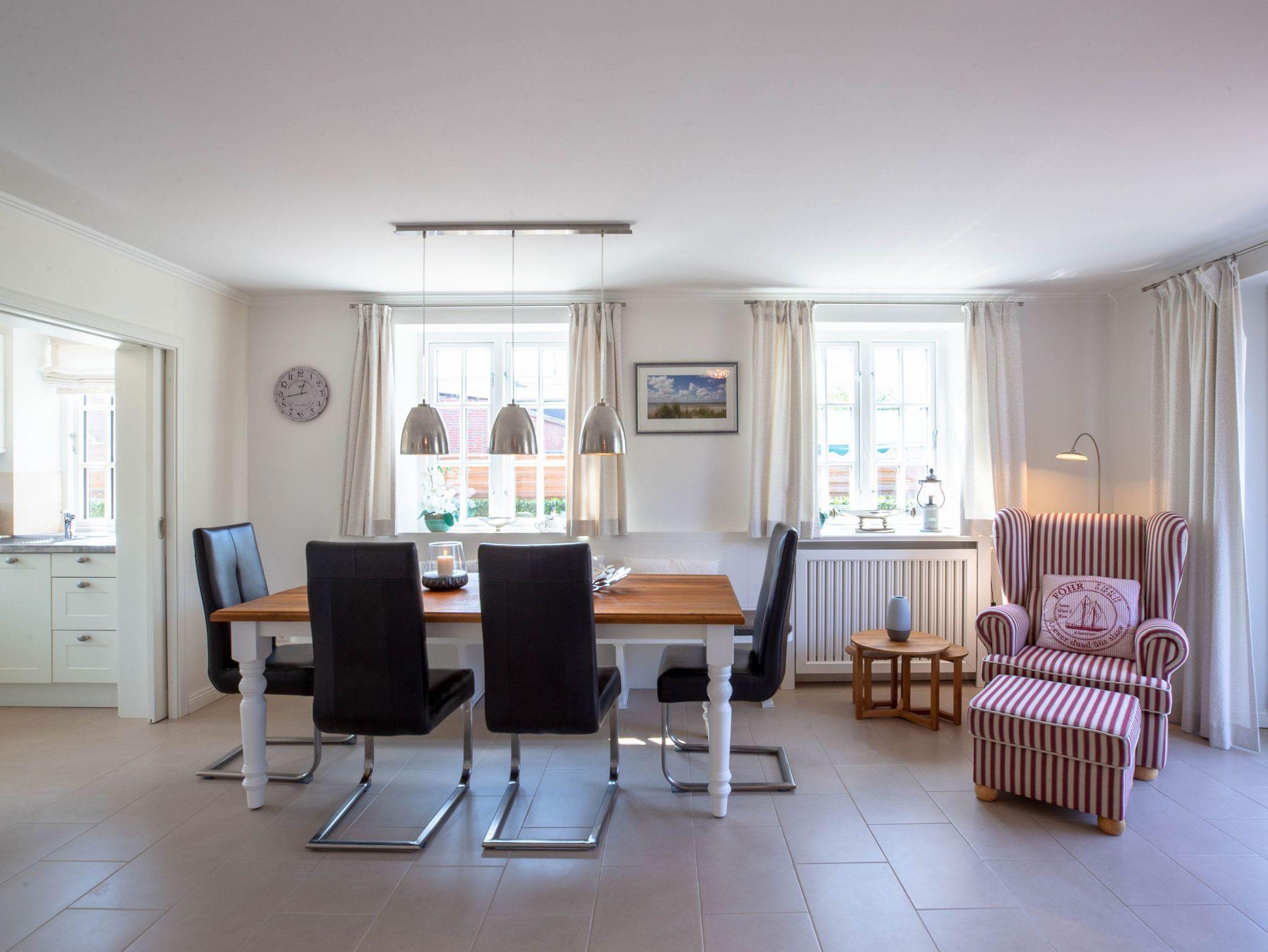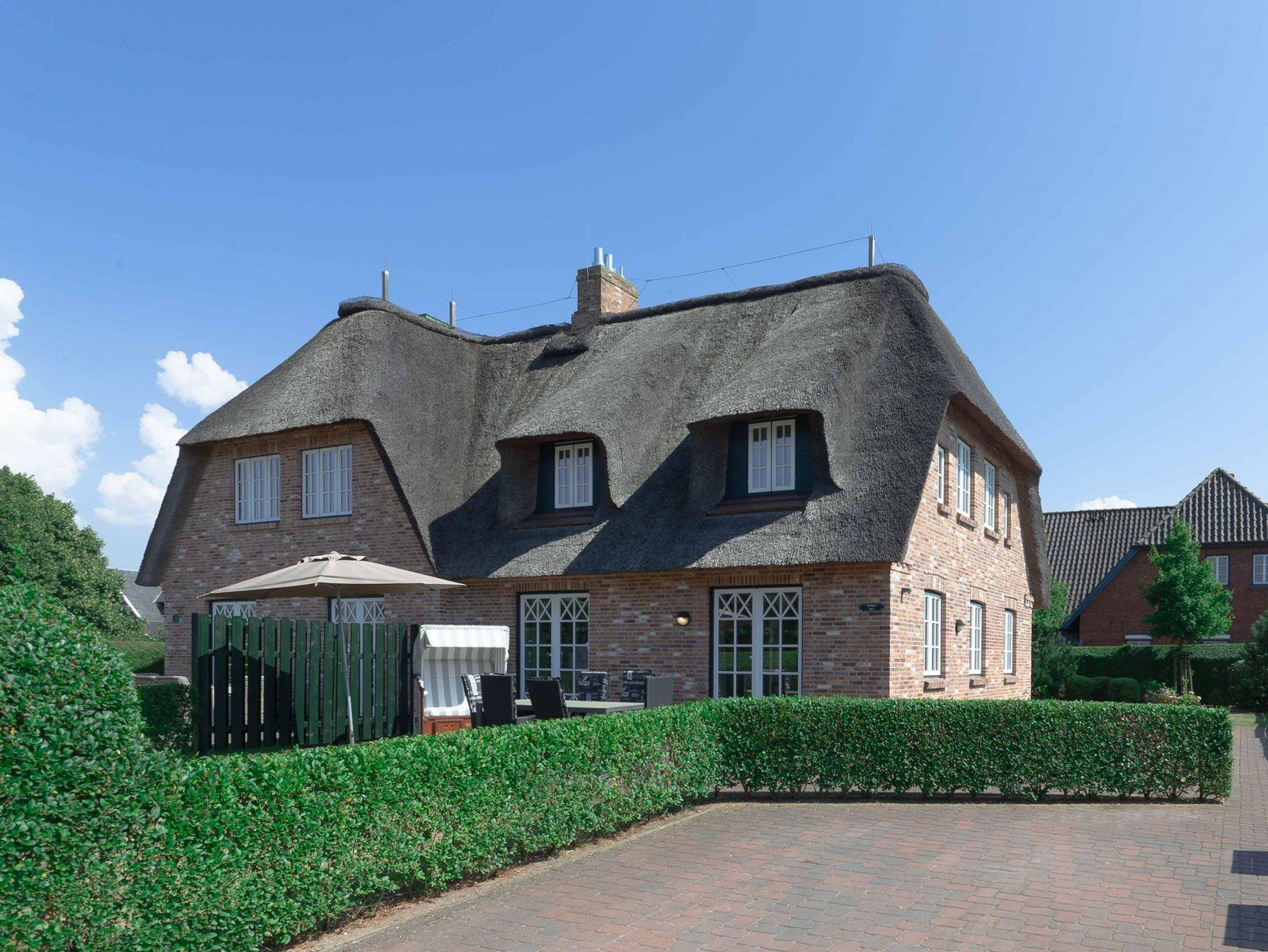 Ein typisches Friesenhaus mit sehr schöner Architektur. Die Summe schöner Details wie Holzsprossenfenster, Reetdach, Fliesen und Holzarbeiten - schafft eine wunderbare Atmosphäre. Das Doppelhaus unter Reet liegt an der Marsch, eingebettet in Wrixum - dem kleinen Nachbarort von Wyk mit dörflichem Charme. In der Nachbarschaft befindet sich ein Café mit leckerem, selbstgebackenem Kuchen, ein Fahrradverleih um die Insel per Rad zu erkunden und die Backstube des ortsansässigen Bäckers. Die Stadt Wyk mit seinen Geschäften und der Promenade sowie vom Strand nur etwa 5 - 10 Fahrradminuten entfernt.