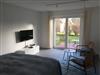 Der Wohnbereich des Apartments ist mit maßangefertigten Einbauschränken und einem Queensize Doppelbett (Breite 1,60 m) vom Tischler ausgestattet. Das Queensize Bett hat zwei Lattenroste mit jeweils verstellbaren Kopf.-und Fußteil, sowie zwei hochwertigen Matratzen von Schlaraffia. Zum Wohnbereich gehören außerdem zwei bequeme Couchsessel, nebst Couchtisch, sowie eine Kommode, die weiteren Stauraum bietet.