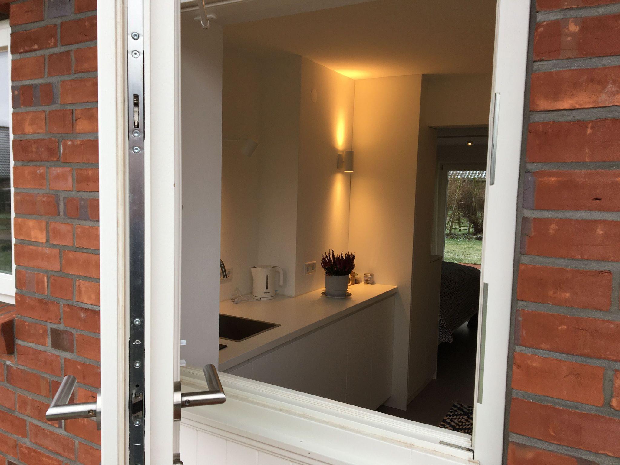 Ein eigener Eingang (Klöntür) und eine nach Osten ausgerichtete eigene Terrasse machen den besonderen Charme dieses Apartments aus. Es verfügt über eine kleine Pantry mit einem 2- Felder Induktionskochfeld, einem Kühlschrank und einer Spüle. In den Küchenschränken befinden sich ausreichend Kochutensilien und Geschirr für zwei Personen.