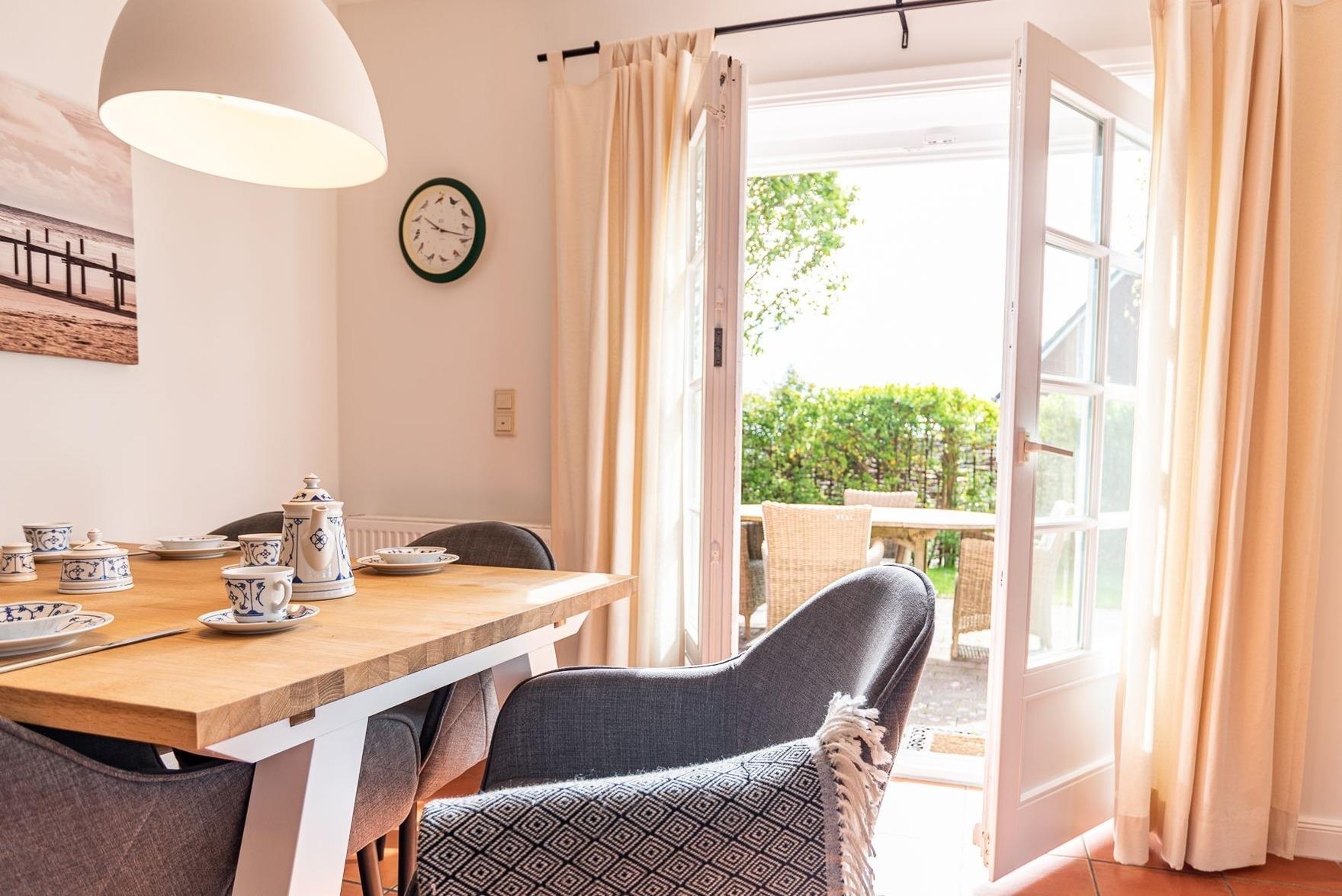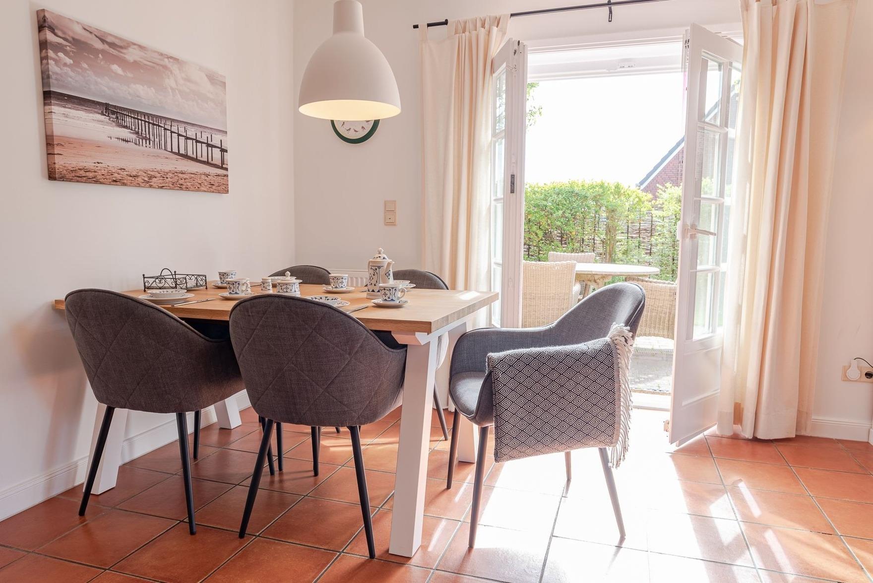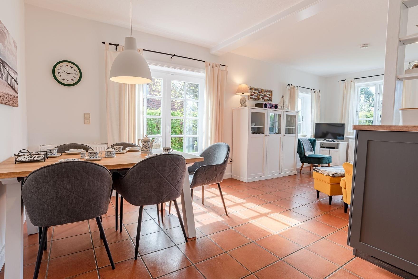 Verbringen Sie ihren Urlaub in einem typischem Föhrer Haus mit Geschichte. Im ehemaligen reetgedeckten Mühlenhaus steht Ihnen Ihr Hausteil mit eigenem Parkplatz sowie einem eigenen Garten mit zwei Terrassen in südwestlicher Ausrichtung zur Verfügung. Im Erdgeschoss des liebevoll eingerichteten Hausteils befindet sich ein offener Wohn- Essbereich mit Küche und das Badezimmer mit Badewanne. Außerdem finden Sie in einem separatem Abstellraum eine Waschmaschine und einen Trockner, die ausschließlich zur Wohnung gehören.