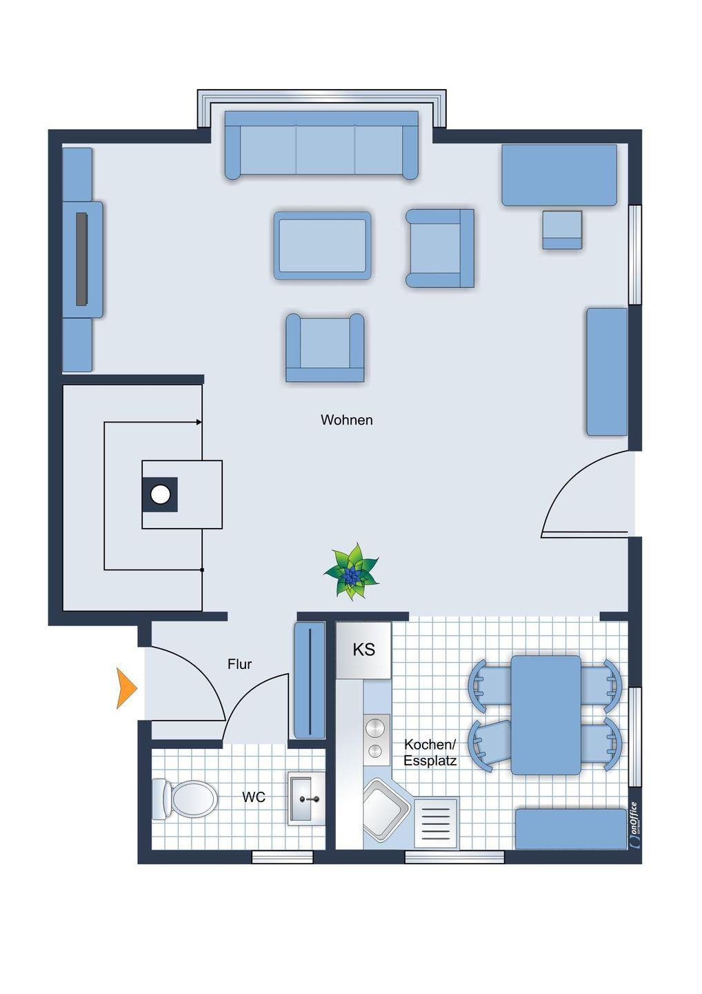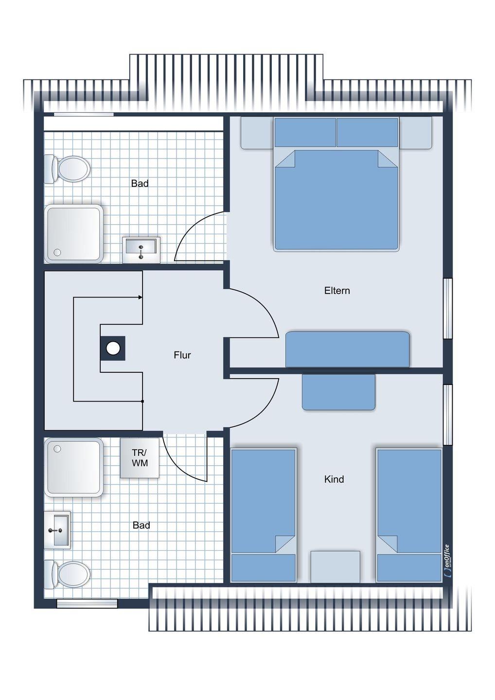 Mit einer Wohnfläche von etwa 95 qm bietet Ihnen diese Unterkunft einen einladenden Eingangsbereich mit Garderobe, ein Schlafzimmer mit einem komfortablen Doppelbett (180x200), ein weiteres Schlafzimmer mit zwei Einzelbetten (90x200), zwei Duschbäder sowie ein Gäste-WC. Der offene Küchenbereich mit Essplatz und der helle Wohnbereich stehen Ihnen ebenfalls zur Verfügung.
