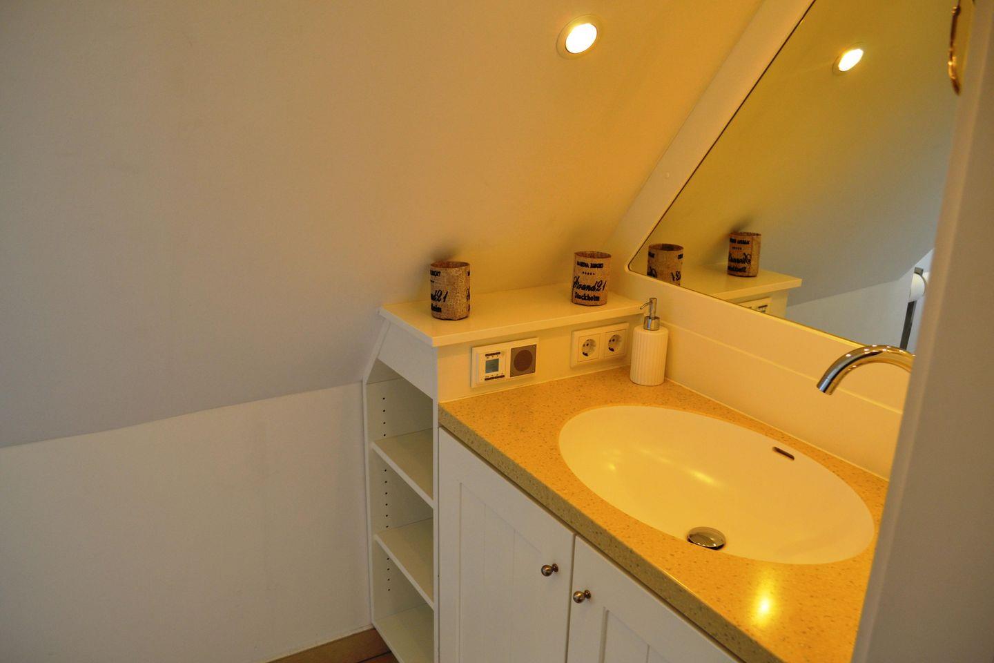 Im Erdgeschoß dieses Hauses befindet sich ein Gäste-WC und das sehr gemütliche Wohnzimmer (Laura Ashley) mit offener Küchenecke, welche sämtlichen Komfort bietet mit Induktionsherd. Im Obergeschoß sind 2 Schlafzimmer (1 x französisches Bett, 1 x Doppelbett) sowie Duschbad/WC. Im Keller des Hausteils befinden sich eine finnische Sauna und die Waschmaschine.