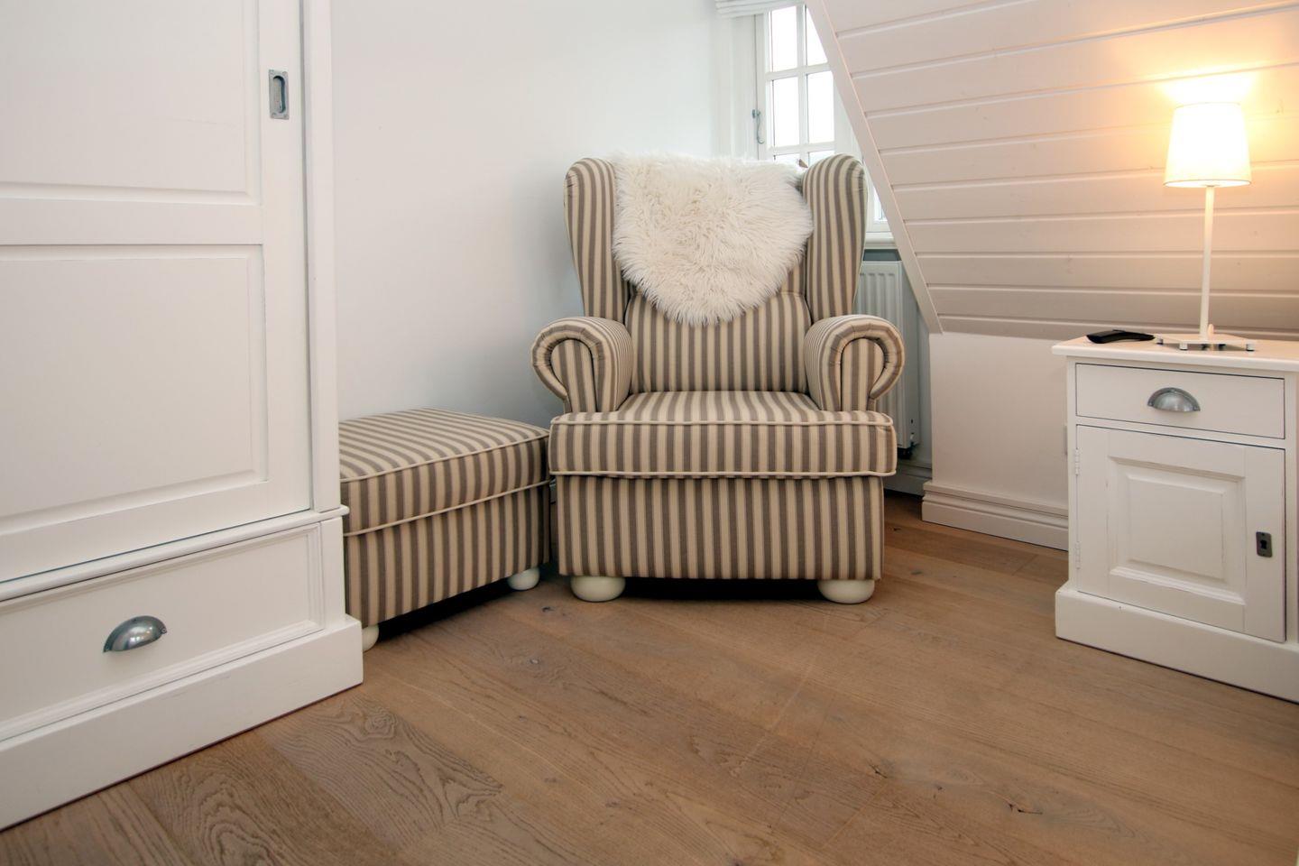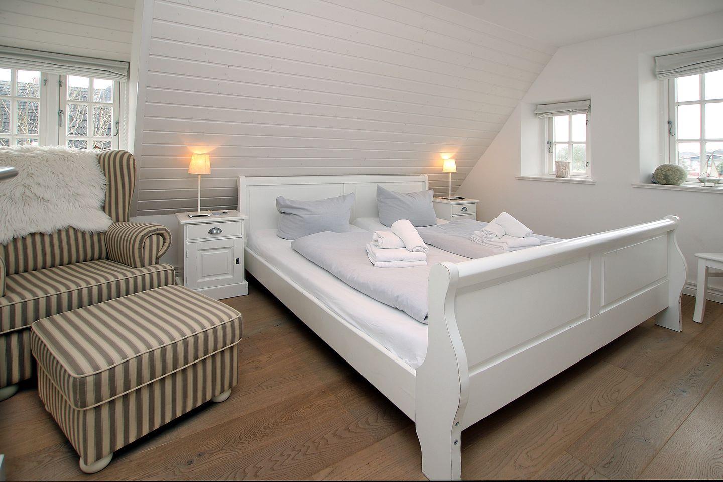 Ferienhaus in Wrixum auf Föhr, Ohl Dörp 55b, Wohnung Nr. 2: Gemütliche 4-Zimmer Doppelhaushälfte (ca. 140 qm) in einem Reetdachhaus. DTV Klassifizierung: 4 Sterne. NICHTRAUCHERHAUS. WOHNZIMMER: Sitzecke, Esstisch und komfortable Küchenzeile, Kaminofen. BAD 1 im EG: Dusche/WC. Eingangsflur und HWR. IM 1 OG befindet sich das BAD 2: Dusche/WC/Wanne und Sauna und 3 Schlafzimmer mit 2 x Doppelbett und 1 x 1 Bett. Die Wohnung ist dörflich, zur Marsch hin gelegen. Das Zentrum vom Wyk erreichen Sie in ca. 20 - 30 Min. Fußweg. Zum Strand sind es mit dem Fahrrad ca. 10 - 15 Minuten. Ein Bäcker ist in der Nachbarschaft. Bettwäsche und Handtücher werden inklusive gestellt. Parkplatz am Haus. Das Haus wurde mit sehr viel Liebe zum Detail ausgestattet und bietet mit der Terrasse und dem Garten (eingezäunt) viel Platz zum Wohlfühlen und Entspannen. Kinderbett und Hochstuhl auf Anfrage inklusive, Babyphone ist vorhanden. Internetanschluss WLAN-Kabel. Das Grillen ist wegen des Reetdaches nur mit einem Elektrogrill erlaubt.