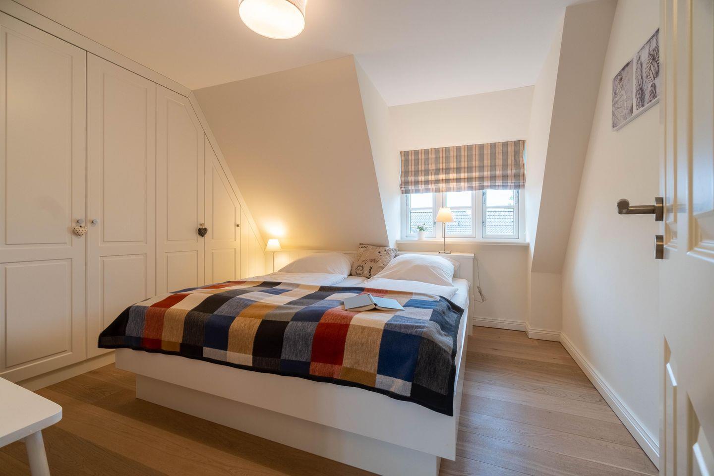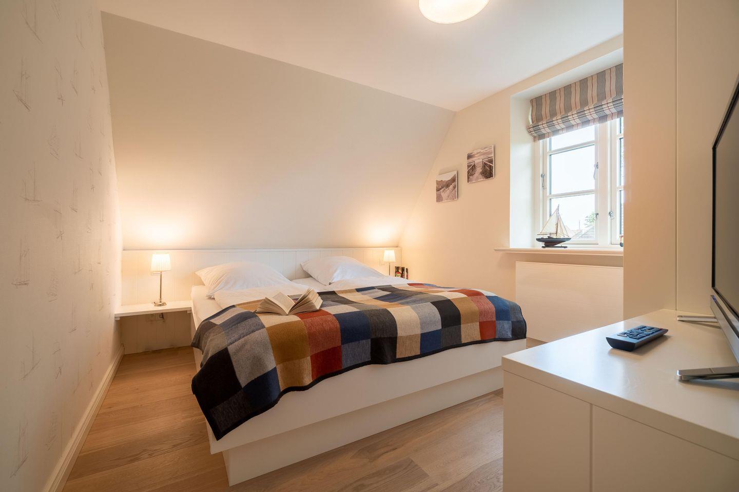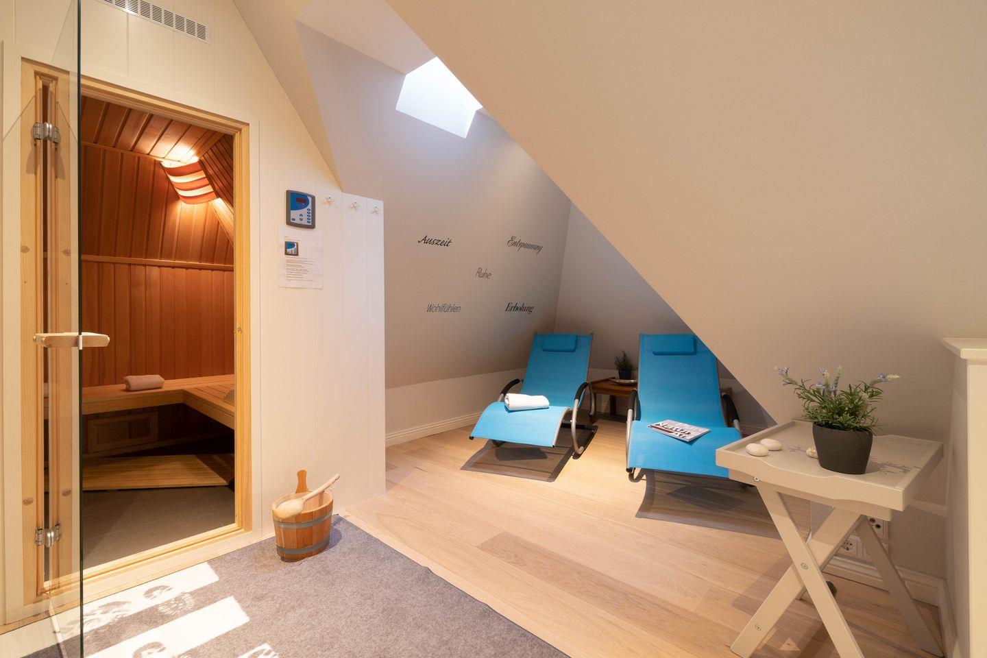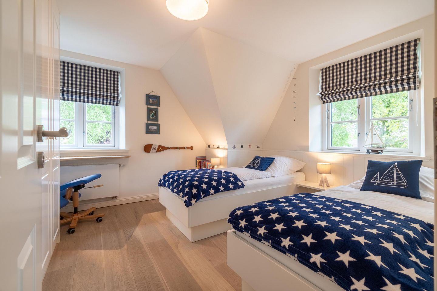 Im Obergeschoss sind die drei Schlafzimmer - zwei mit je einem Doppelbett und eines mit zwei Einzelbetten - sowie das zweite Duschbad gelegen. Zwei Schlafzimmer verfügen jeweils über einen Fernseher und einen Einbauschrank. Die hauseigene Sauna samt Ruhebereich und eine kleine Spielecke befinden sich im Dachgeschoss der Unterkunft.