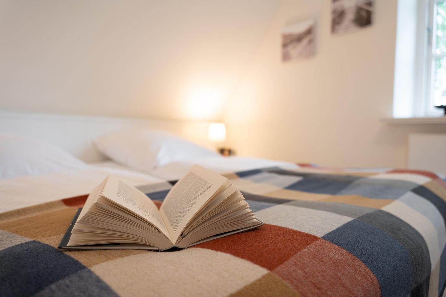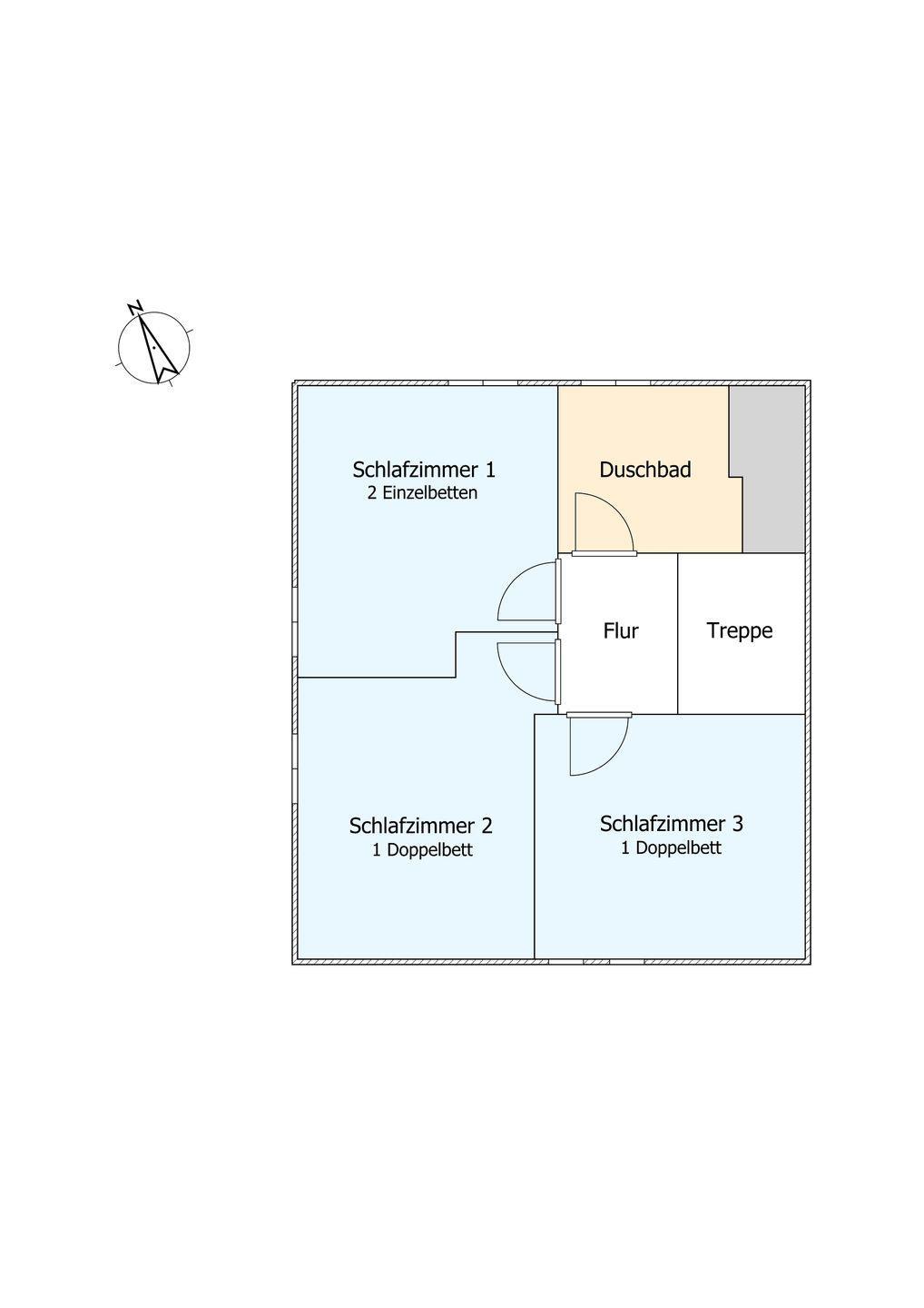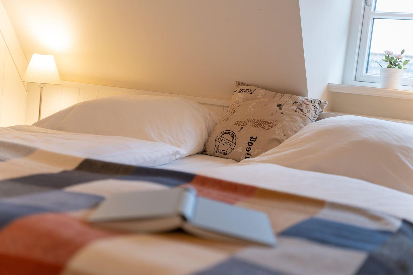 Im Obergeschoss sind die drei Schlafzimmer - zwei mit je einem Doppelbett und eines mit zwei Einzelbetten - sowie das zweite Duschbad gelegen. Zwei Schlafzimmer verfügen jeweils über einen Fernseher und einen Einbauschrank. Die hauseigene Sauna samt Ruhebereich und eine kleine Spielecke befinden sich im Dachgeschoss der Unterkunft.