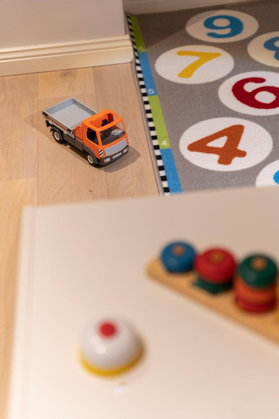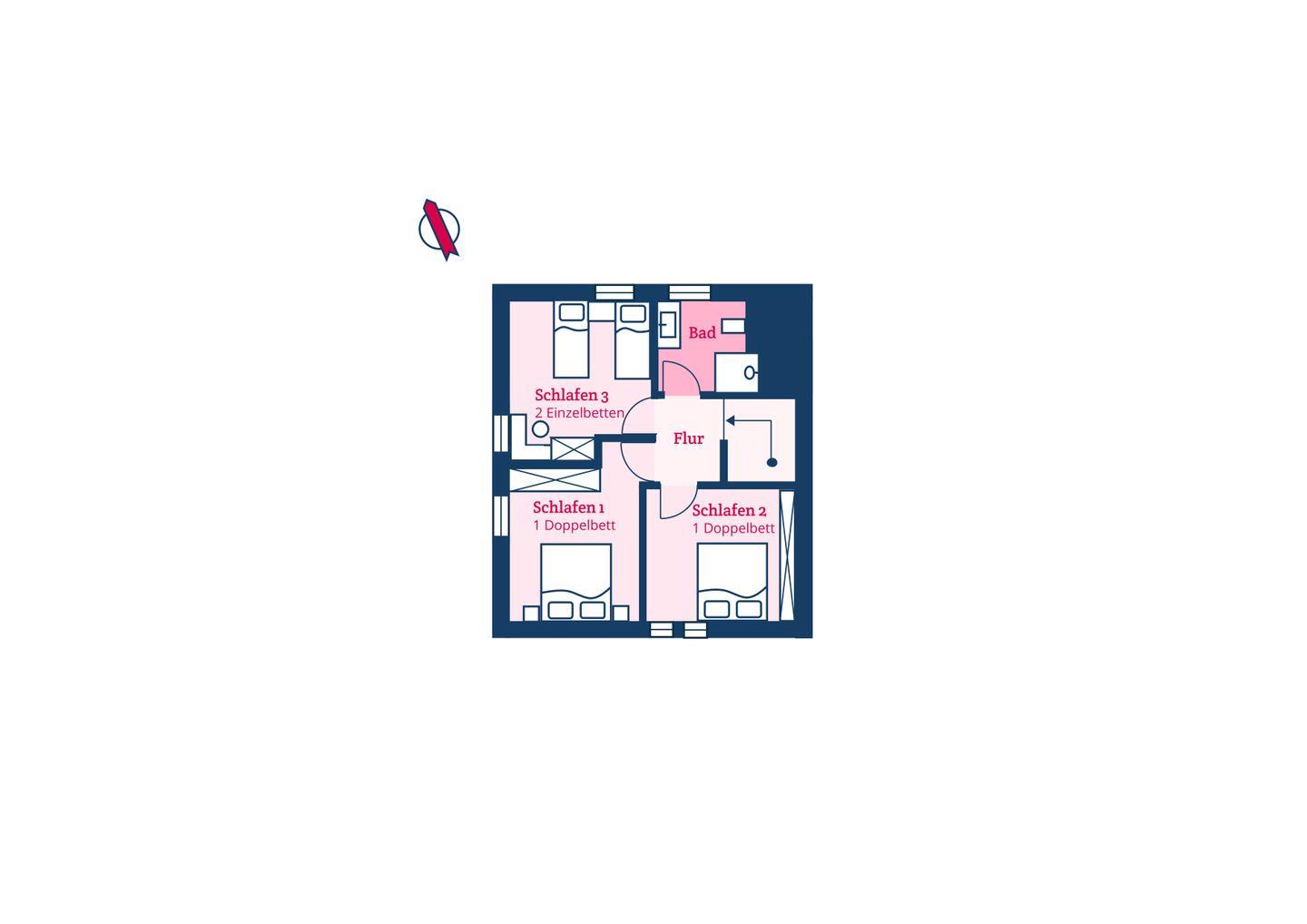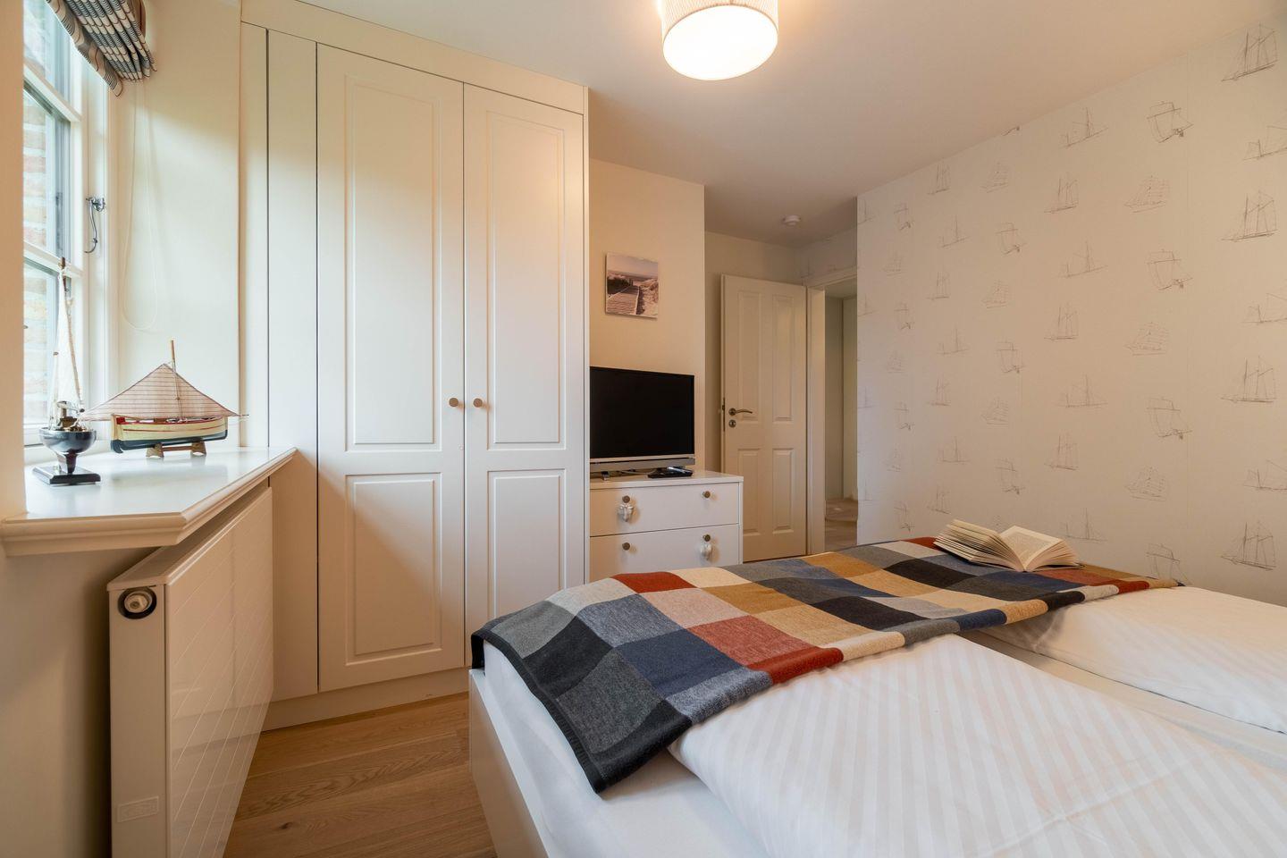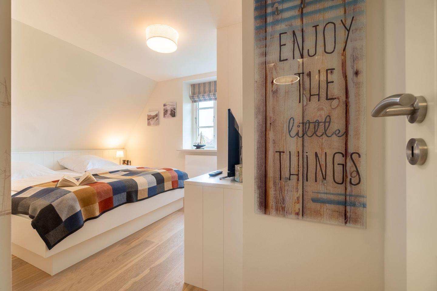 Im Obergeschoss sind die drei Schlafzimmer - zwei mit je einem Doppelbett und eines mit zwei Einzelbetten - sowie das zweite Duschbad gelegen. Zwei Schlafzimmer verfügen jeweils über einen Fernseher und einen Einbauschrank. Die hauseigene Sauna samt Ruhebereich und eine kleine Spielecke befinden sich im Dachgeschoss der Unterkunft.