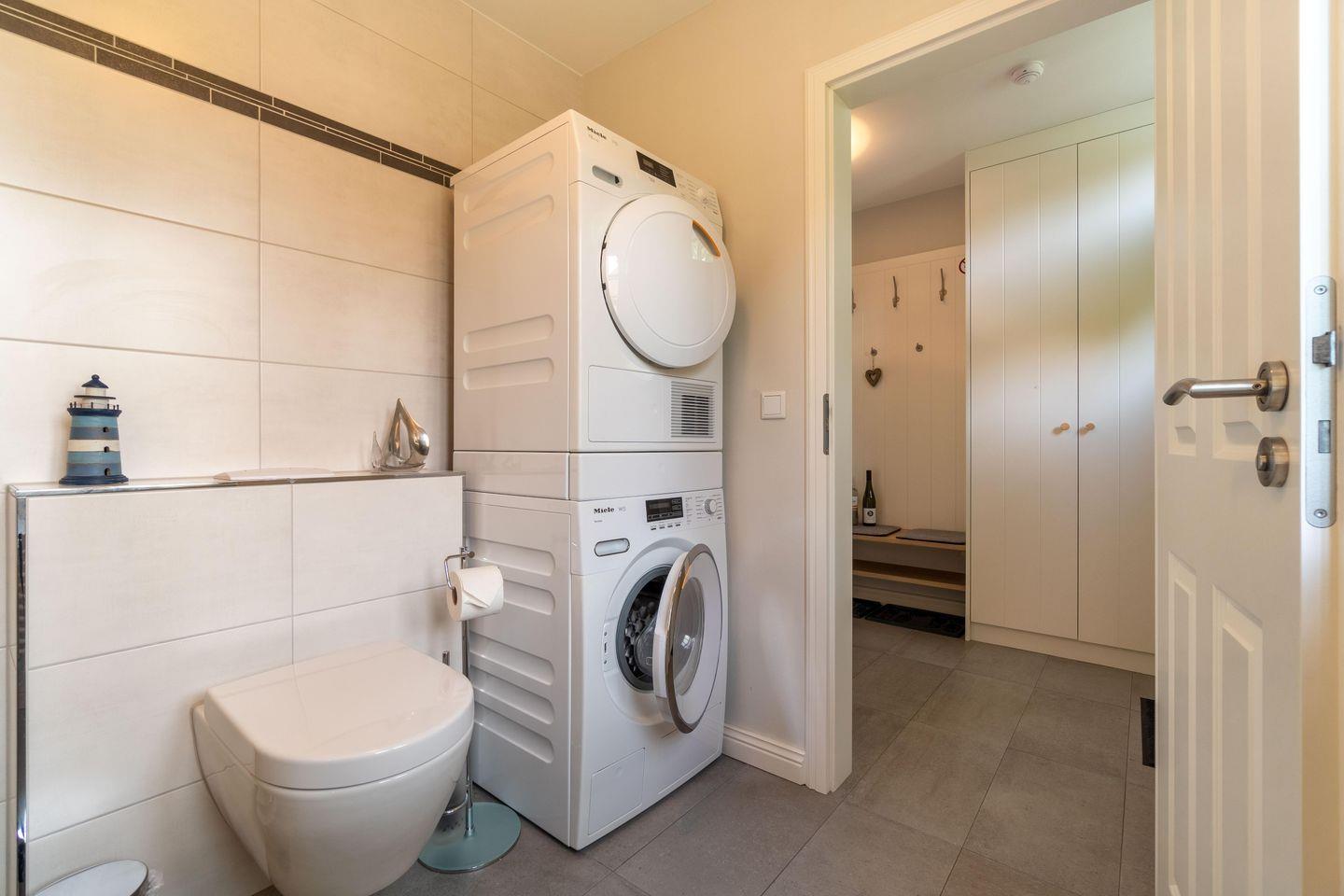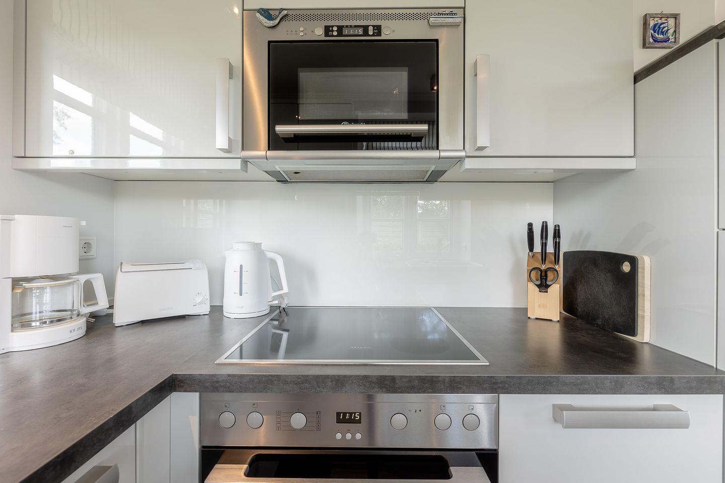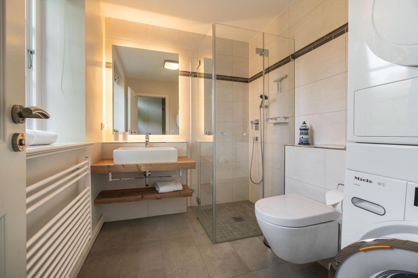 Im Erdgeschoss befinden sich der großzügige Wohn- und Essbereich mit offener Küche sowie ein Bad mit bodengleicher Dusche. Über den Essbereich gelangen Sie direkt auf die eigenen Terrassen und in den Garten. Der Original Mylin-Kachelofen sorgt auch an kühleren Tagen für eine wohlige Atmosphäre. Im Badezimmer stehen Ihnen eine Waschmaschine und ein Trockner zur Verfügung - selbstverständlich kostenlos!