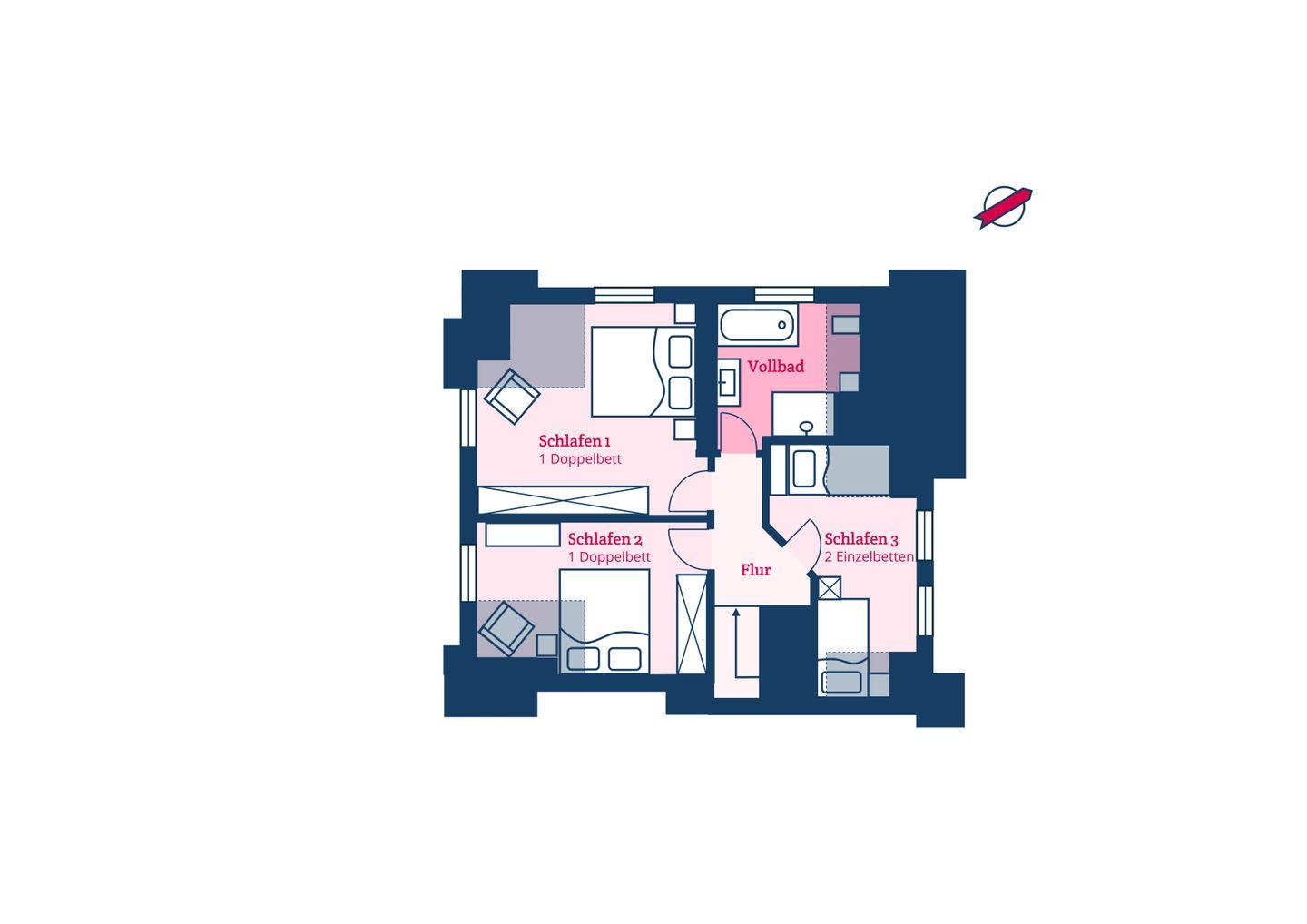 Im Obergeschoss sind die drei Schlafzimmer sowie ein Vollbad mit Wanne und Dusche gelegen. Zwei Schlafzimmer verfügen über je ein Doppelbett, da dritte Schlafzimmer über zwei Einzelbetten.