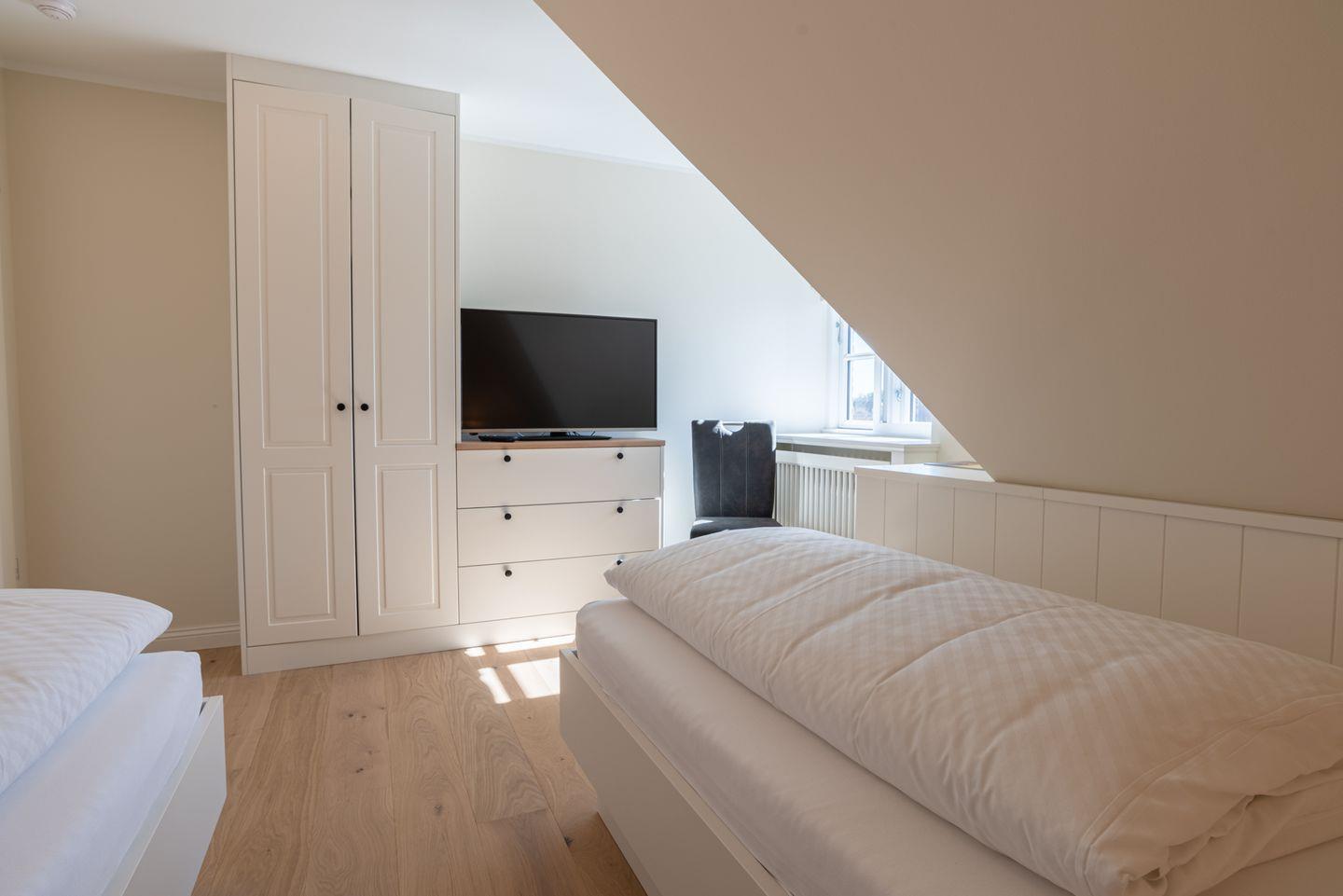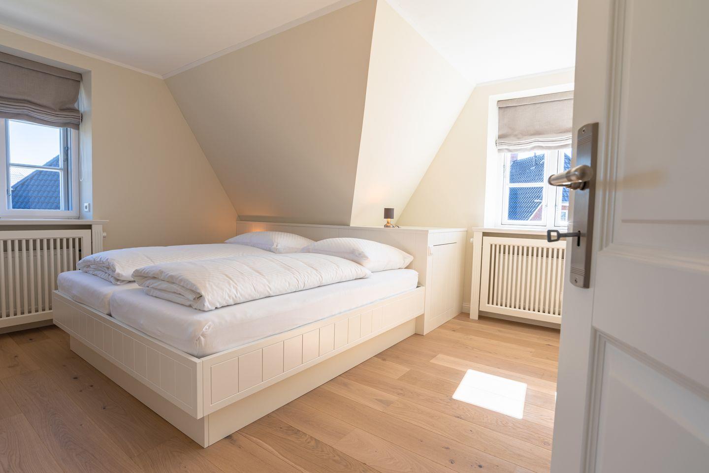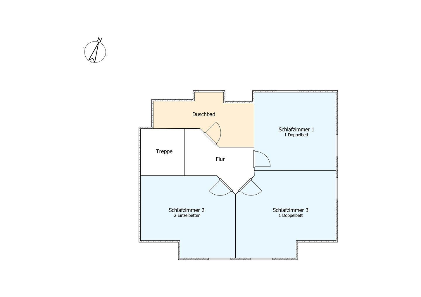 Im Obergeschoss sind die drei Schlafzimmer sowie ein zweites Duschbad gelegen. Zwei Schlafzimmer sind jeweils mit einem Doppelbett ausgestattet, das dritte mit zwei Einzelbetten.