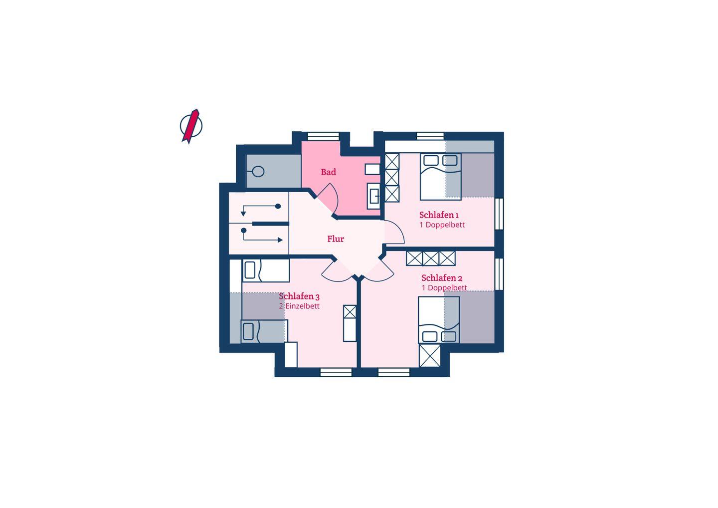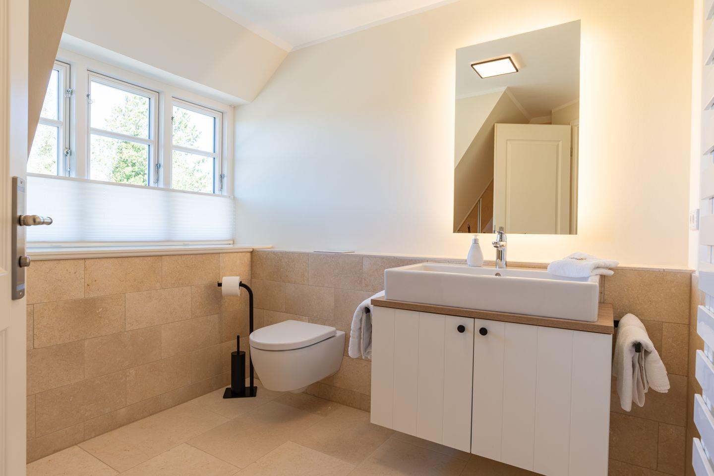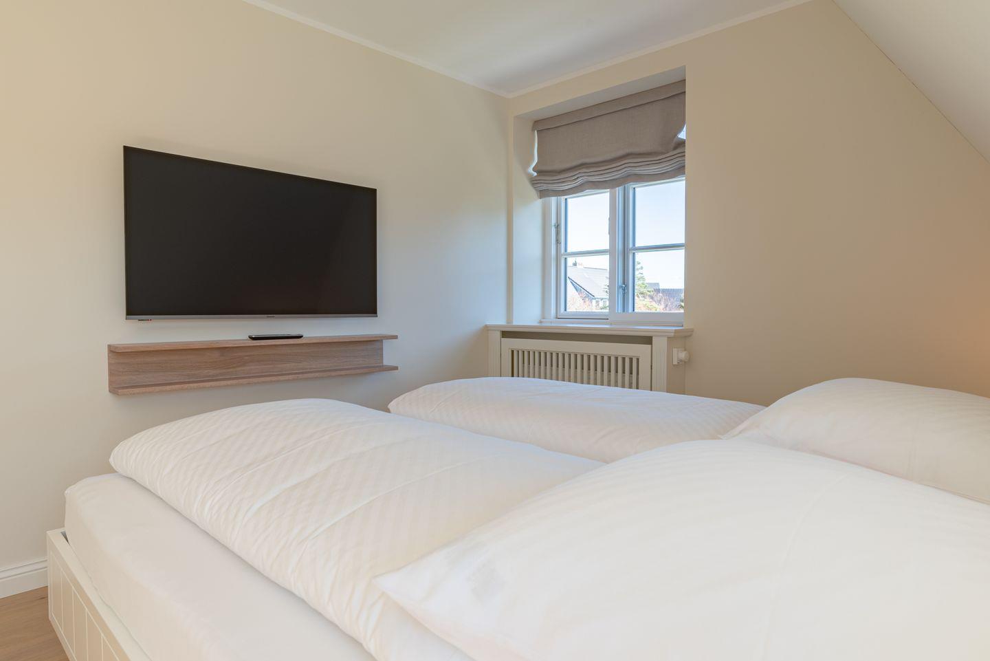 Im Obergeschoss sind die drei Schlafzimmer sowie ein zweites Duschbad gelegen. Zwei Schlafzimmer sind jeweils mit einem Doppelbett ausgestattet, das dritte mit zwei Einzelbetten.