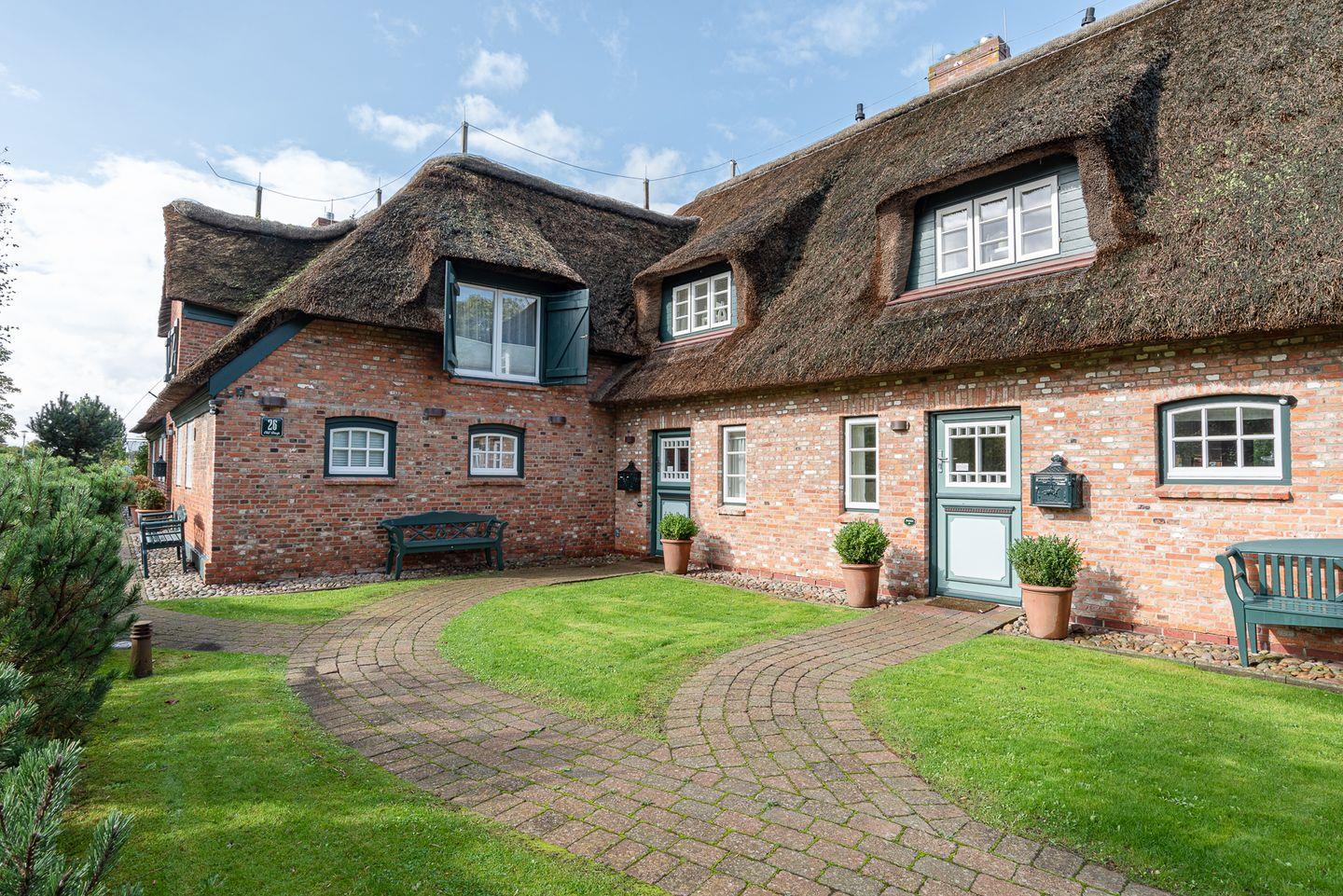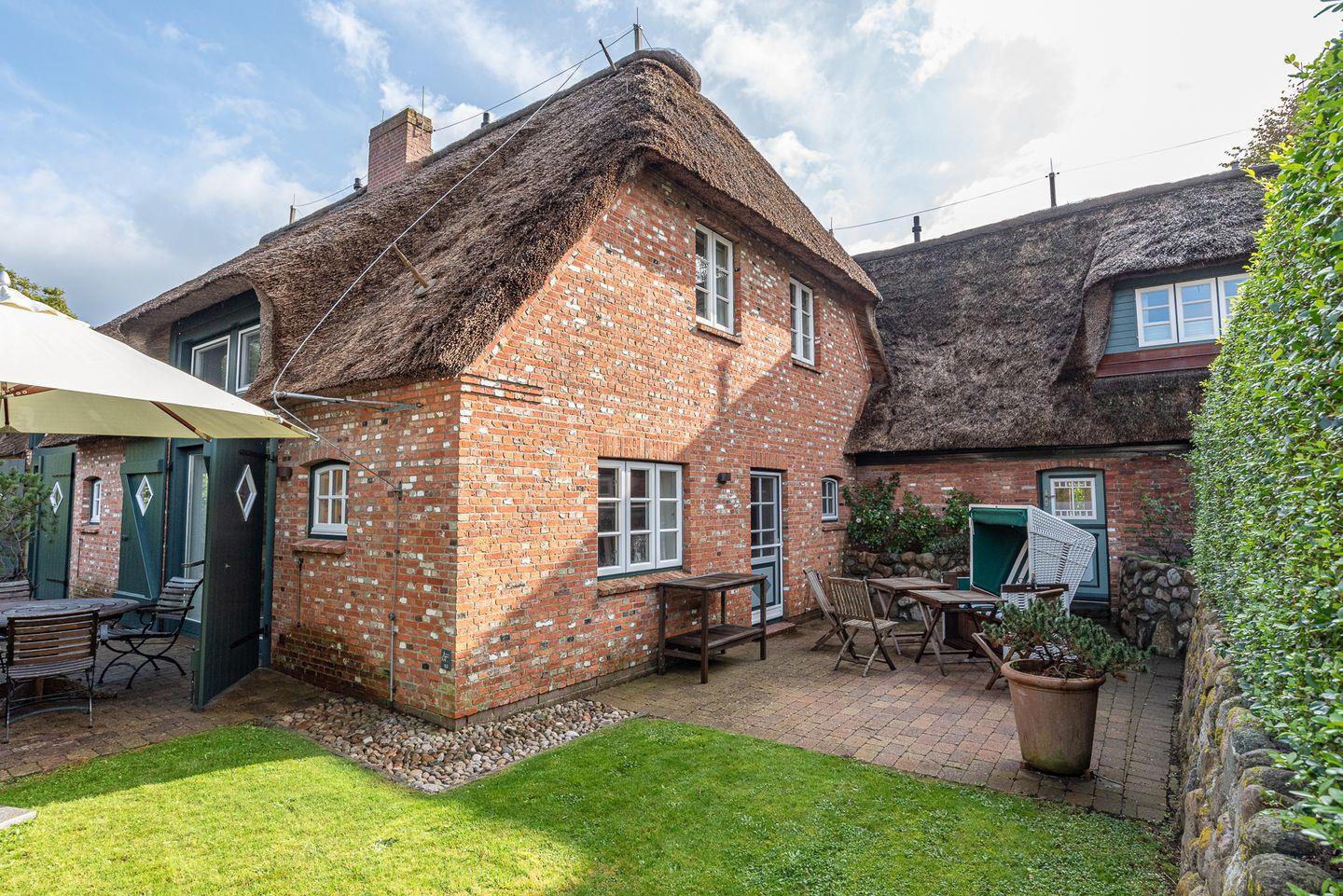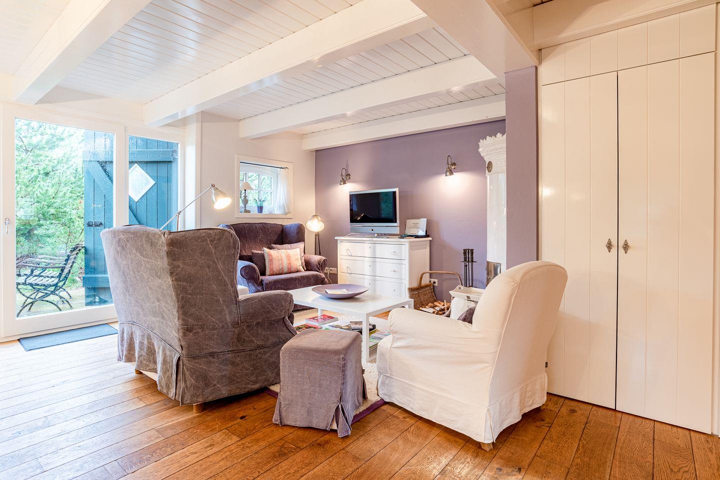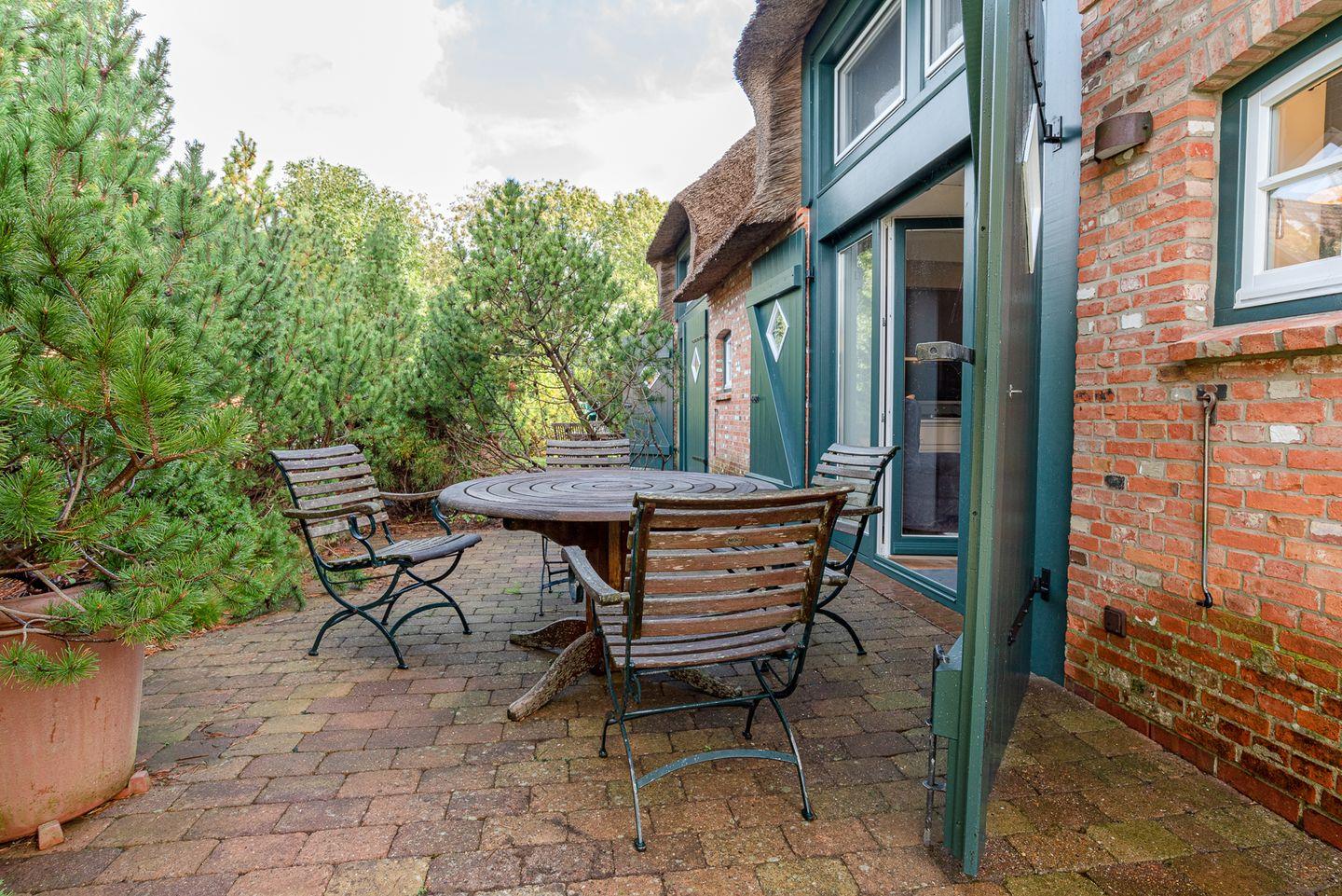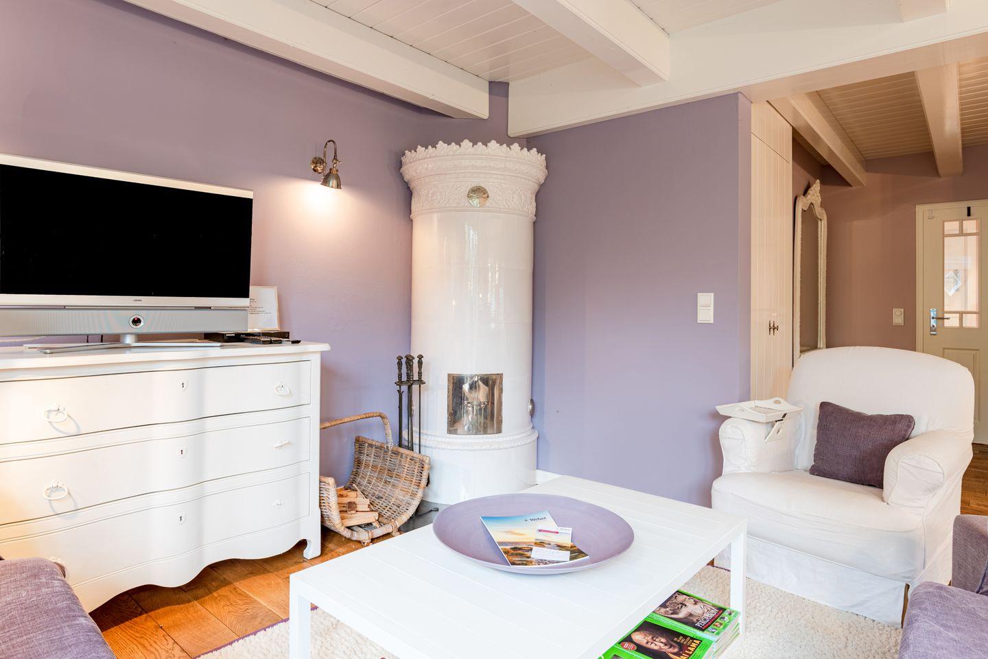 Reetgedeckte Ferienwohnung in attraktiver Randlage mit Original Mylin-Kachelofen und eigenem Gartenabschnitt mit zwei Terrassen.