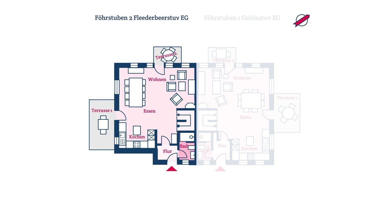 Die Ferienwohnung Fleederbeerstuv im Haus Föhrstuben verfügt über 3 Schlafzimmer und 2 Bäder und bietet somit komfortabel Platz für bis zu 4 Personen zuzüglich einer Kleinkinderaufbettung. Auch bis zu 2 Hunde sind herzlich willkommen.