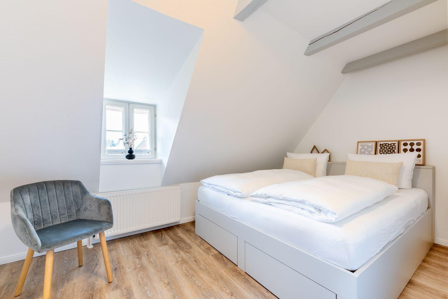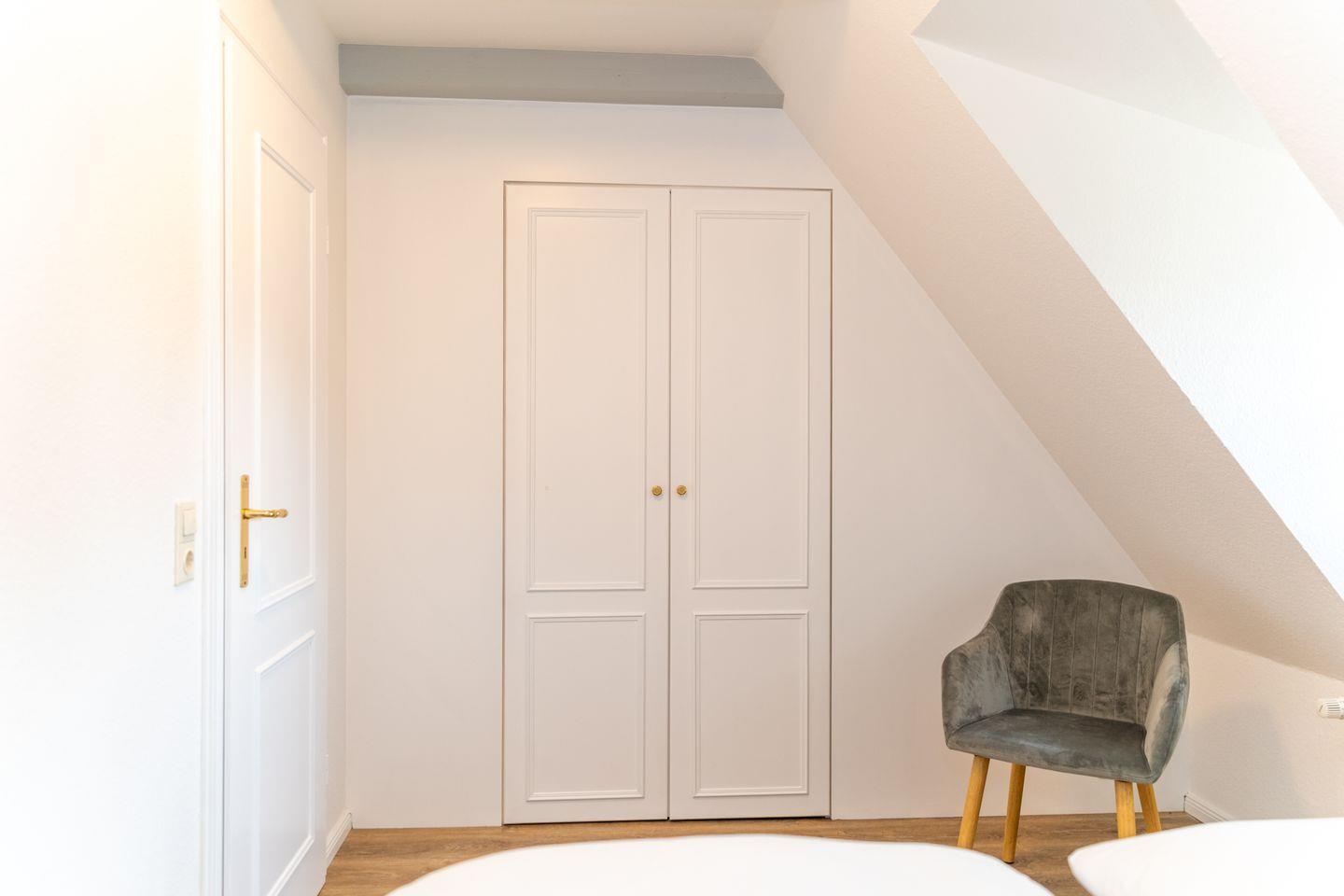 Im Oberen Bereich befindet sich ein Schlafzimmer mit Ankleide sowie ein weiteres Schlafzimmer mit einem Einzelbett. Auch ein Duschbadezimmer mit WC ist hier vorhanden.