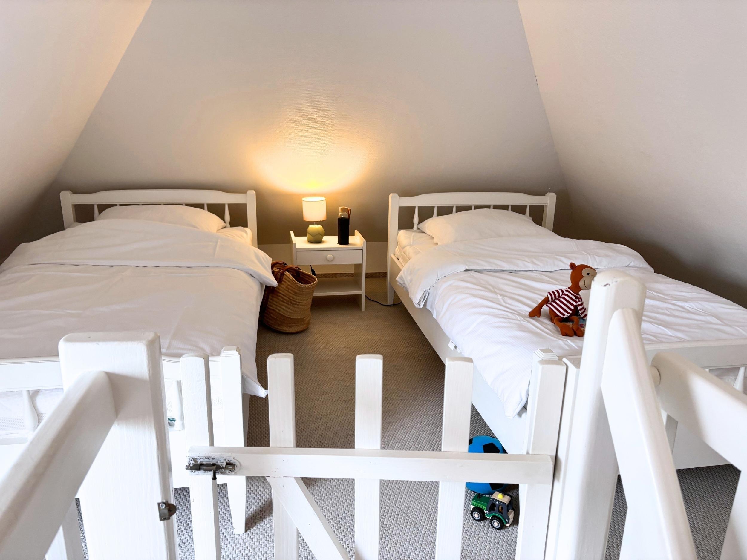 Karl Sonnenstrahl befindet sich im rechten Obergeschoss des Hauses am Teich. Die schöne Ferienwohnung mit Balkon ist für vier Personen ausgestattet und hat zwei Schlafzimmer - einer davon ist über eine weitere Treppe erreichbar. Der Balkon geht von der Wohnküche ab und ist gen Westen gerichtet. Hier können Sie die Abendsonne einfangen.