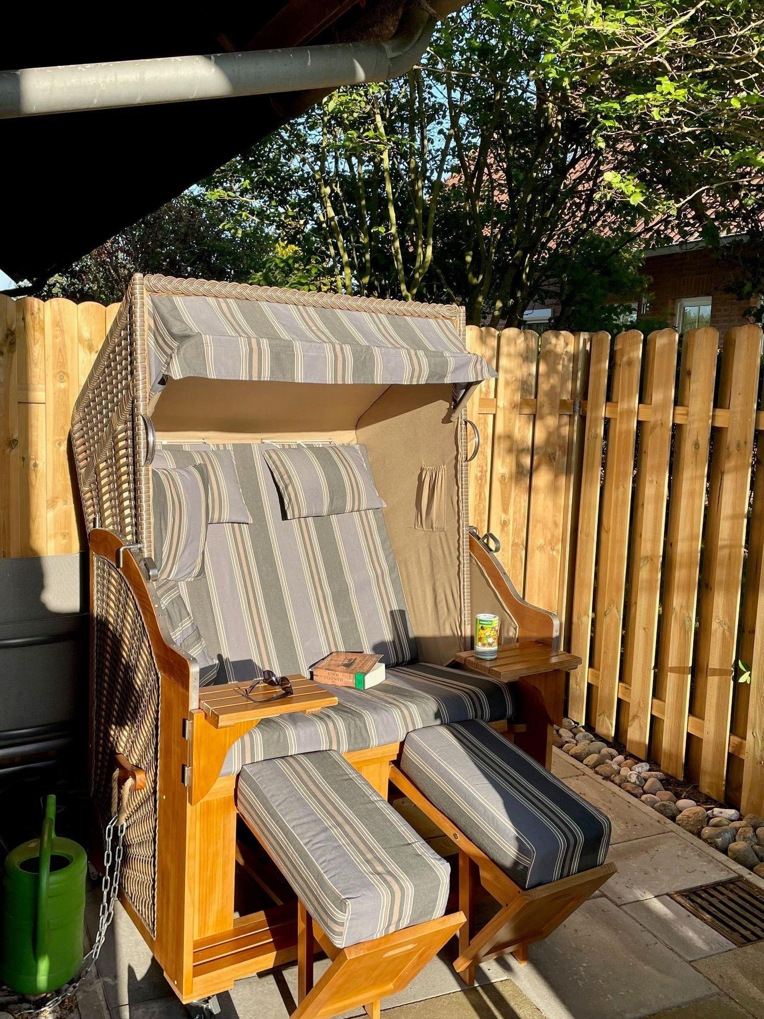 Die Südwest-Terrasse ist mit Strandkorb und Gartenmöbeln ausgestattet. Sitzauflagen befinden sich im Haus, Grill im Carport-Abstellraum, in dem auch mitgebrachte Fahrräder eingeschlossen werden können. Der zwischen Terrasse und Carport liegende Gartenanteil eignet sich als Spielzone für Kleinkinder.