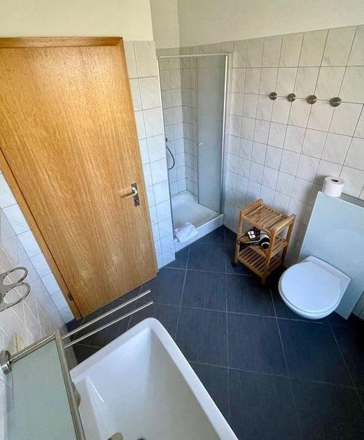 Das frisch renovierte Bad verfügt über Dusche, Waschbecken und Toilette und Föhn. Waschmaschine (mit Trockengestell, Bügelbrett und Bügeleisen) im separaten Abstellraum.