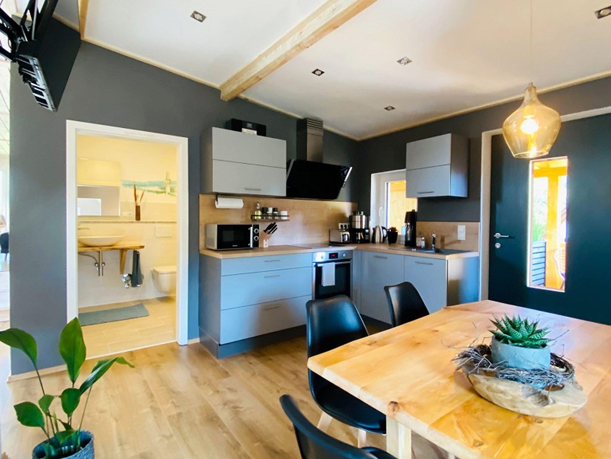 Großer Essbereich sowie eine hochwertige, voll ausgestattete Küche mit Kühl-/Gefrierschrank, Backofen, großes Induktionskochfeld, Filterkaffeemaschine mit Mahlwerk, Sodastream inkl. Gaskartusche, Mikrowelle, Spülmaschine und modernen Markengeräten.