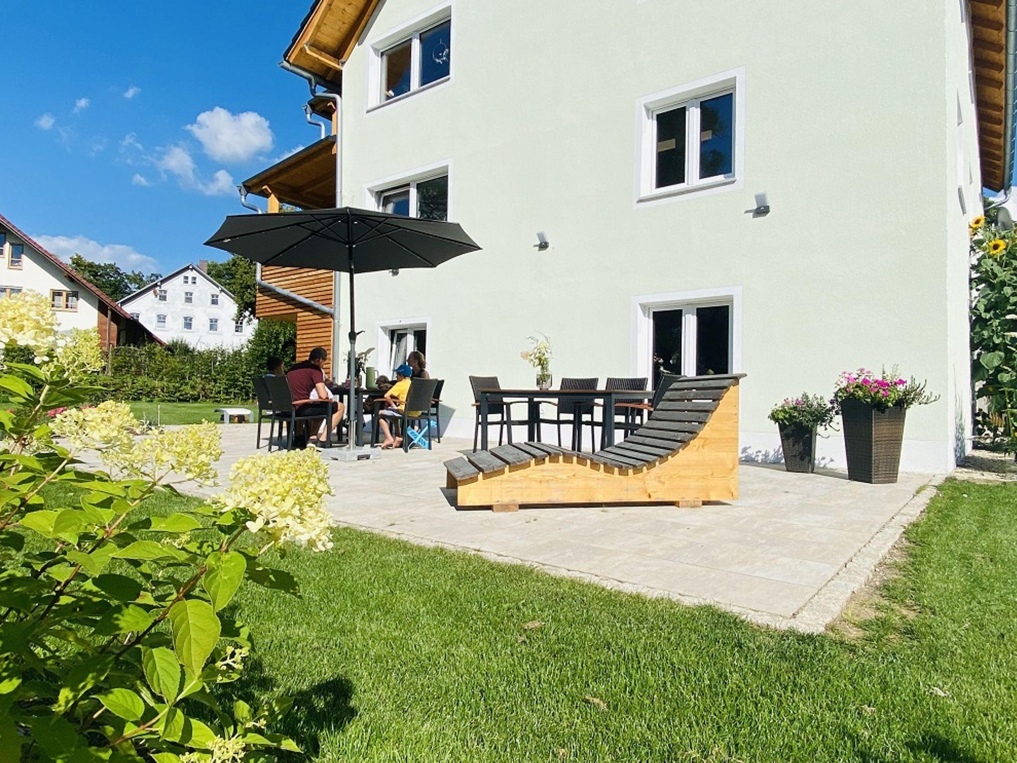 Unsere 5-Sterne Wohnungen sind modern eingerichtet und bieten euch einen hohen Komfort, eine hochwertige, voll ausgestattete Küche sowie ein modernes geräumiges Bad. Alle Wohnungen verfügen über einen eigenen Balkon mit Sitzgruppe, Fußbodenheizung, Waschmaschine, Staubsauger, Bügelbrett/Bügeleisen, Smart TV, Sound-Box, W-LAN und Safe. Die Fasssauna mit Ruheraum, die große Sonnenterrasse, sowie der Frühstücksraum sind für alle Gäste gemeinsam nutzbar. Unsere kleinen Gäste finden altersgerechte Spiele in der Ferienwohnung sowie Fahrzeuge und Spielgeräte in der Spielscheune im Garten.