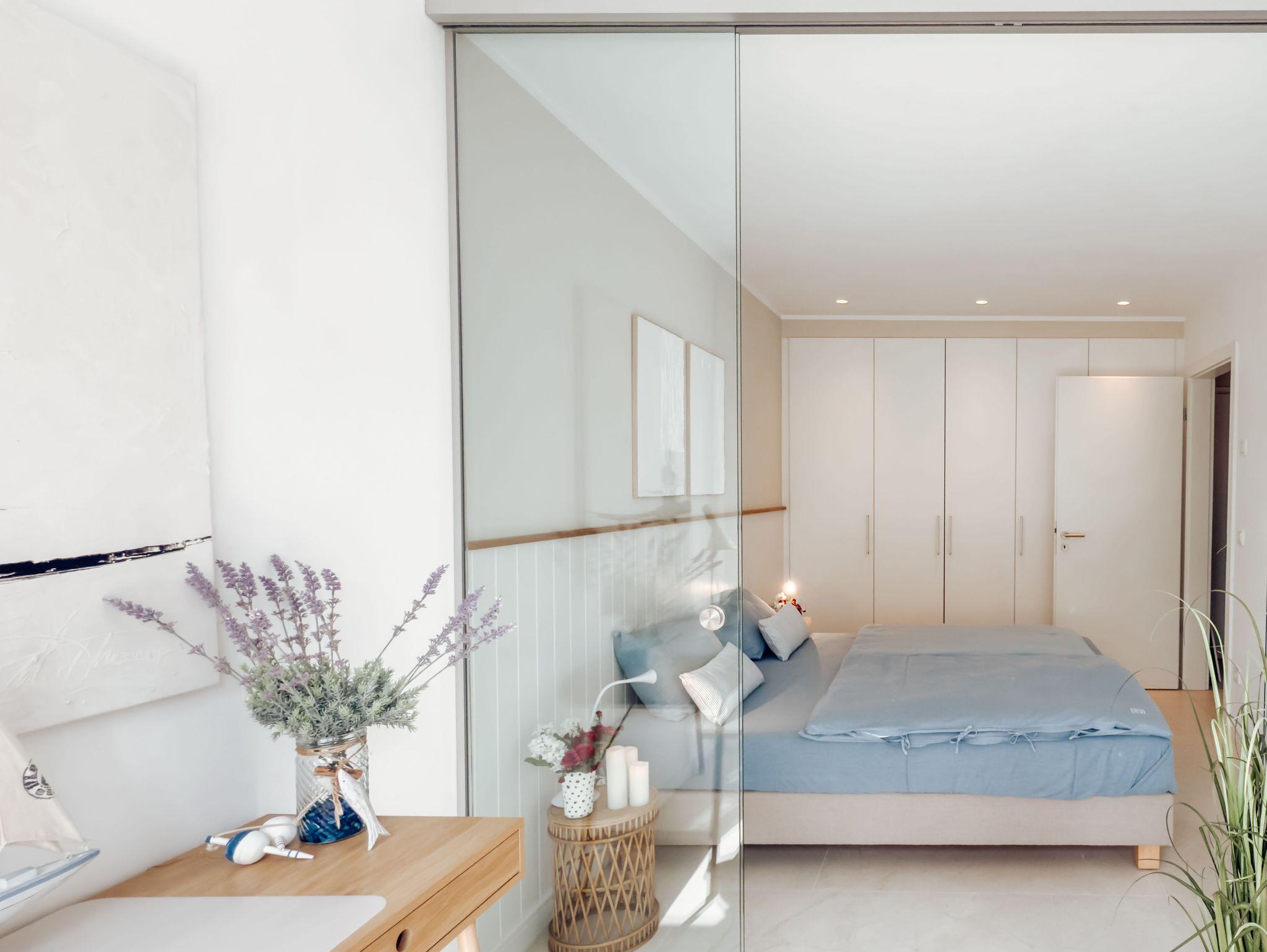 Das separate Schlafzimmer verfügt über ein gemütliches Doppelbett. Hier finden Sie auch einen Arbeitsplatz, der durch eine Glasschiebetür vom Schlafzimmer getrennt werden kann. Das helle Tageslichtbad ist mit einer ebenerdigen Dusche ausgestattet und bietet somit zusätzlichen Komfort. Für angenehme Wärme in allen Räumen sorgt eine Fußbodenheizung.