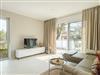Der Wohnbereich ist mit einer bequemen Ledercouch und Flat TV ausgestattet.