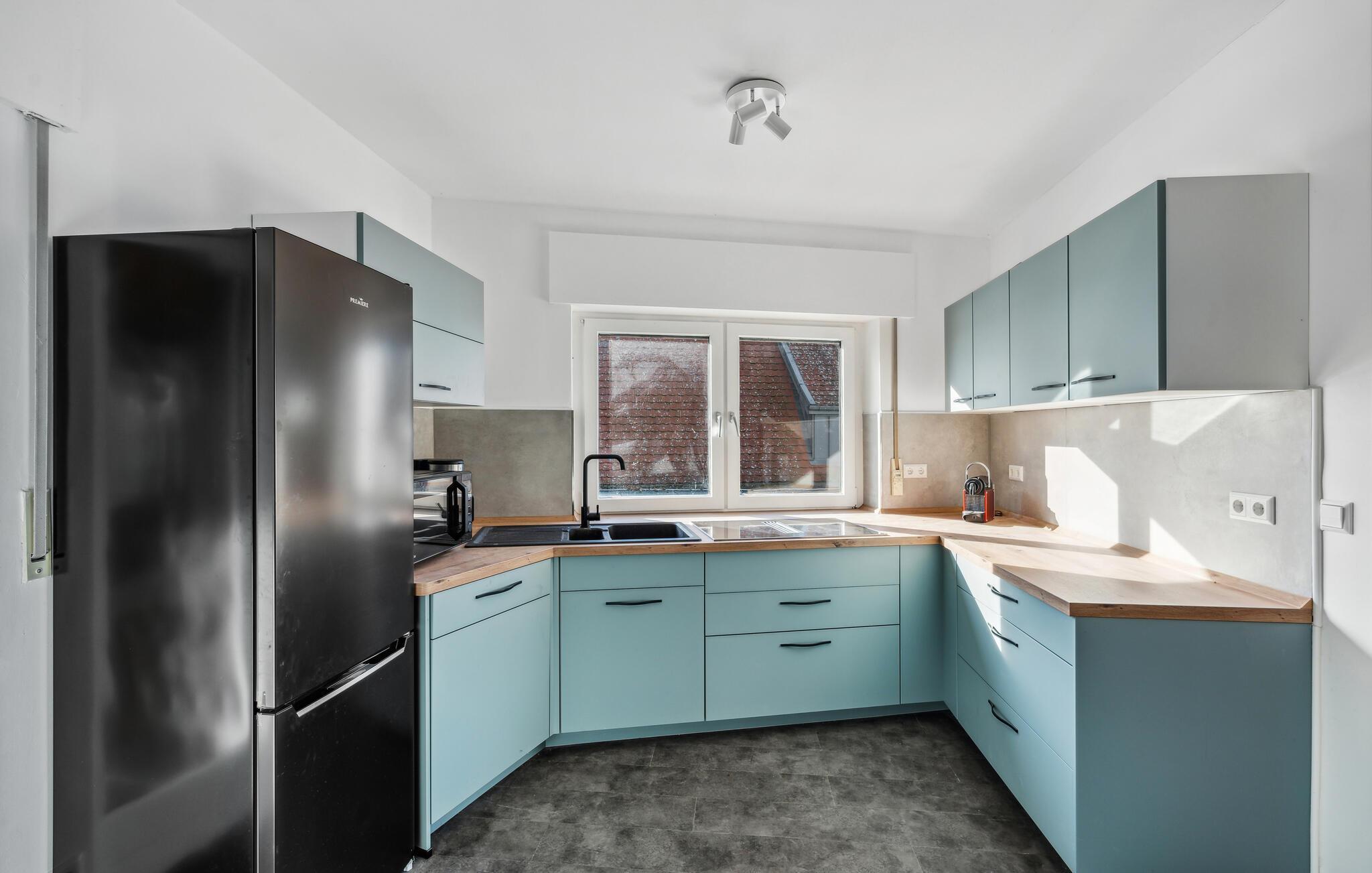 Feriehuset imponerer også med sit kvalitetsinteriør. Sov i det kærligt møblerede soveværelse og nyd det behagelige indeklima med åndbar kalkpuds i husets andre rum. Tilbered jeres måltider i det moderne køkken med sprøjtestøbt komfur og emhætte, og glæd jer til hyggelige aftener ved gaspejsen. Der er to toiletter og et badeværelse med bruseniche.