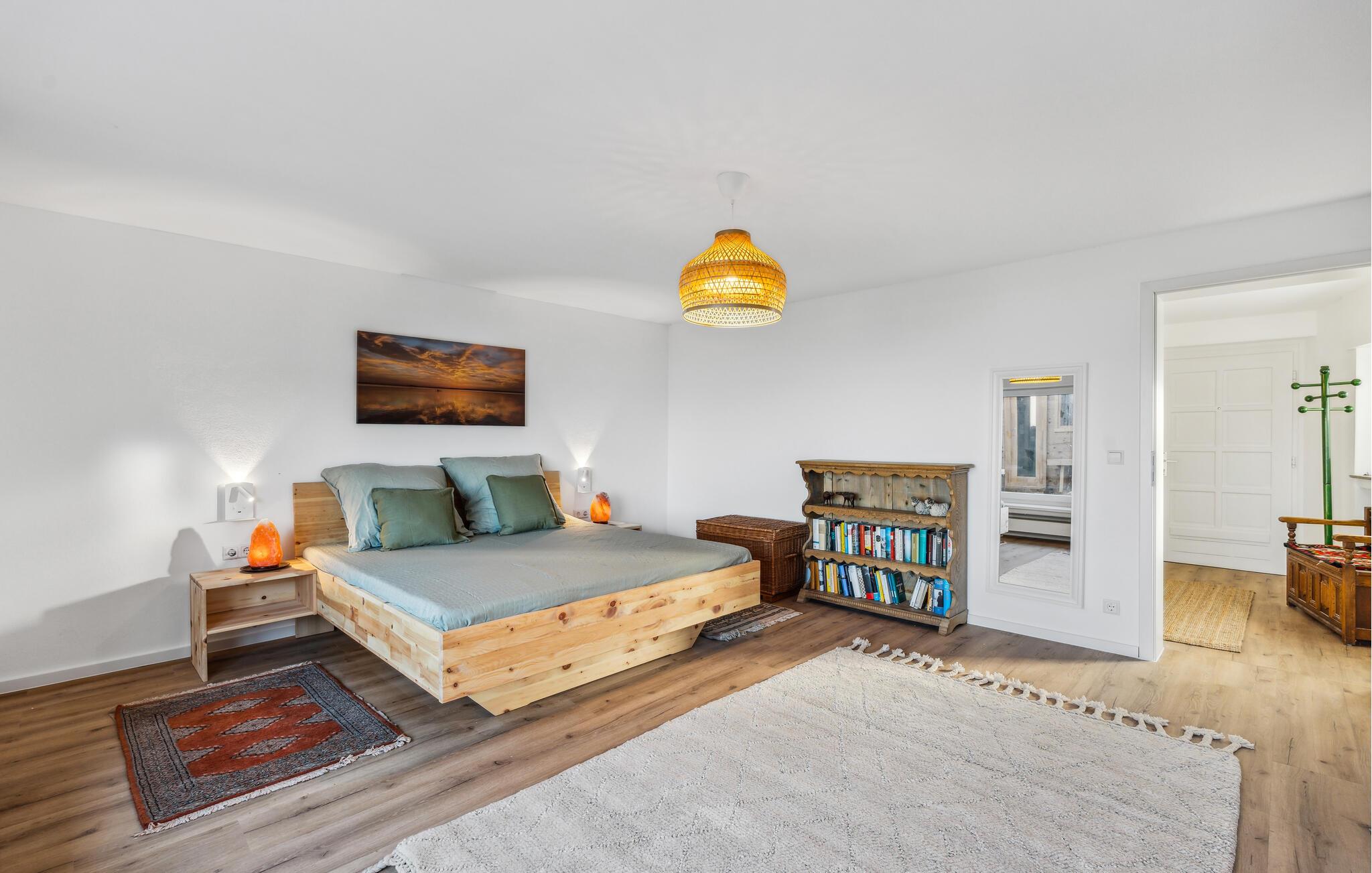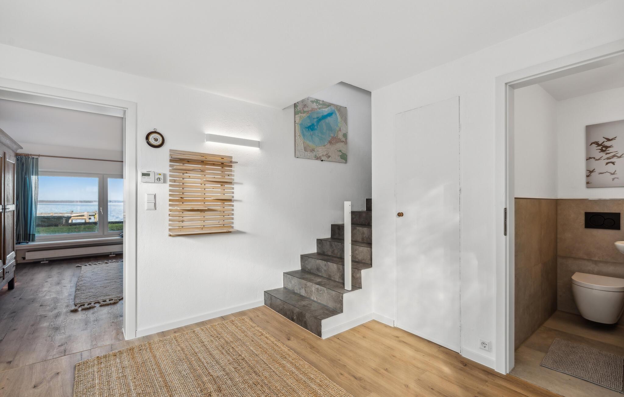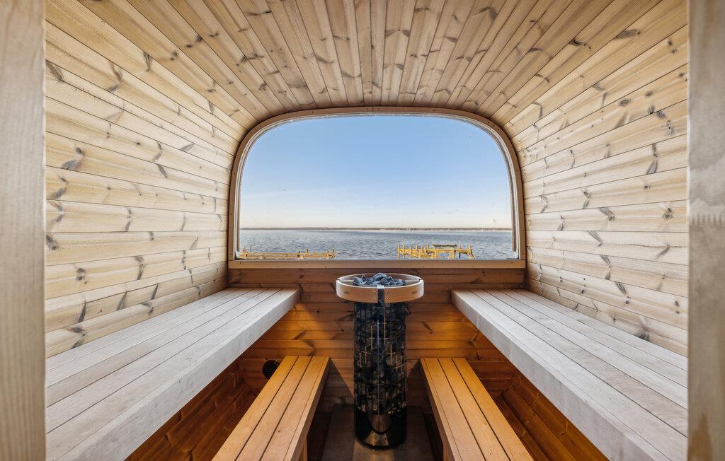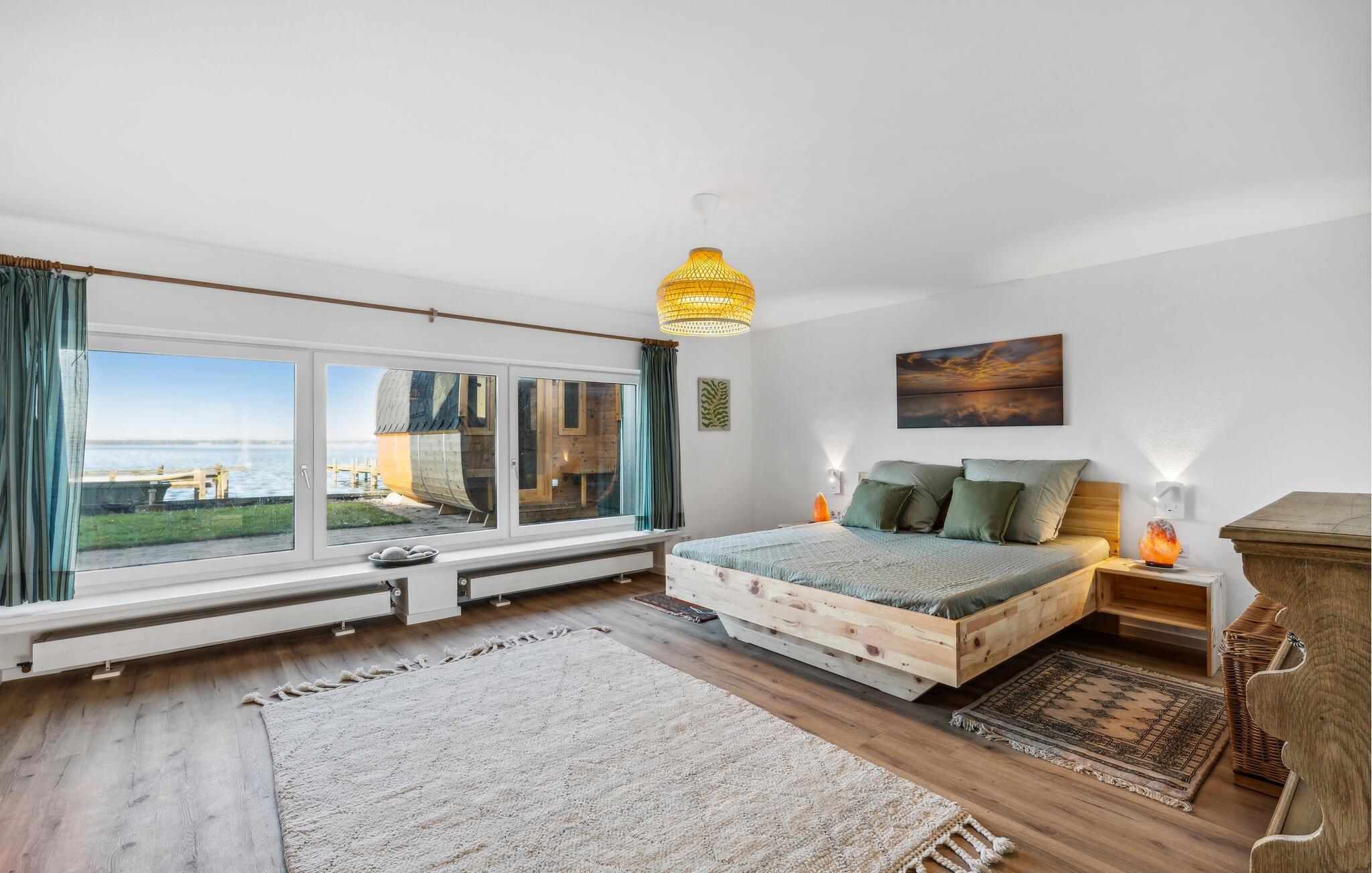 Et af vores højdepunkter venter jer i haven: en privat bjælkehyttesauna lige ved vandet med et stort panoramavindue, der tilbyder udsigt over den glitrende Steinhude Sø. Nyd den hyggelige varme, og se sejlbåde og havfugle direkte fra saunaen. Efter jeres saunatur kan I bruge udendørsbruseren og slappe af i saunaens forværelse eller på terrassen. Fra ejendommen og saunaen har I en klar udsigt mod nordvest over Wilhelmstein-øen og uforglemmelige solnedgange.