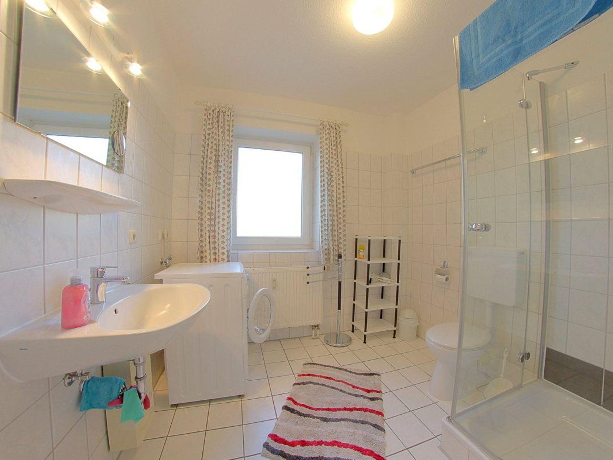 Das geräumige Duschbad mit großer Dusche, Fenster und Waschmaschine bietet ausreichend Platz.