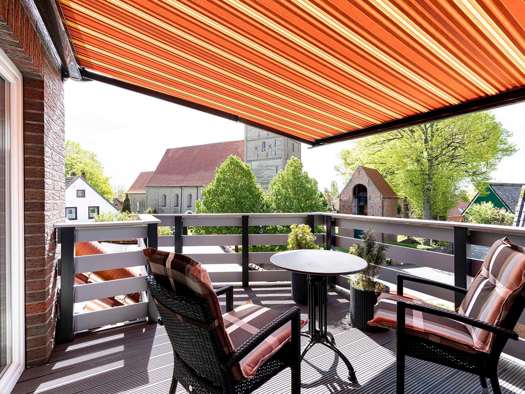 Durch die Nordost- / Südwest-Ausrichtung haben Sie am Morgen Sonne im Schlafzimmer und am Nachmittag Sonne auf dem Balkon. Hier gibt es einen Tisch mit zwei Stühlen, eine elektrisch ausfahrbare Markise und einen herrlichen Blick auf die jahrhundertealte St. Willehadi-Kirche.