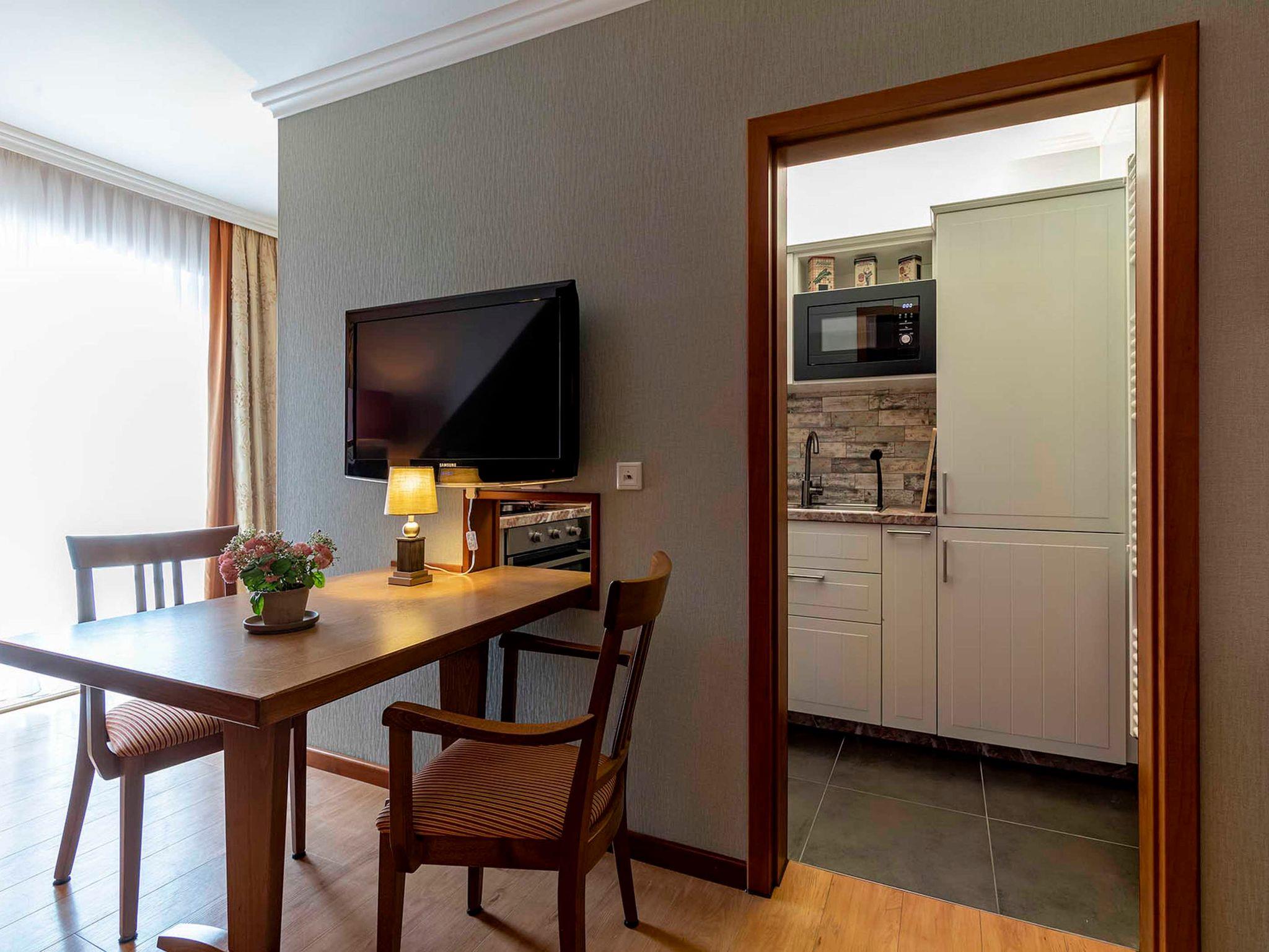 Der Flur mit Garderobe und Wandschrank teilt die Wohnung in ein Schlafzimmer mit angeschlossenem Bad und ein Wohnzimmer mit voll ausgestatteter Kitchenette, Esstisch und direktem Zugang zum Balkon.