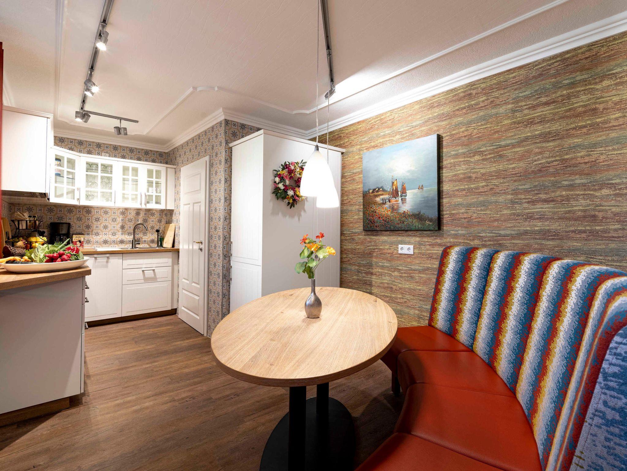 Ihre Unterkunft empfängt Sie mit einer voll ausgestatteten, moderne Küche mit Esstisch für 4 Personen und Gartenblick.
