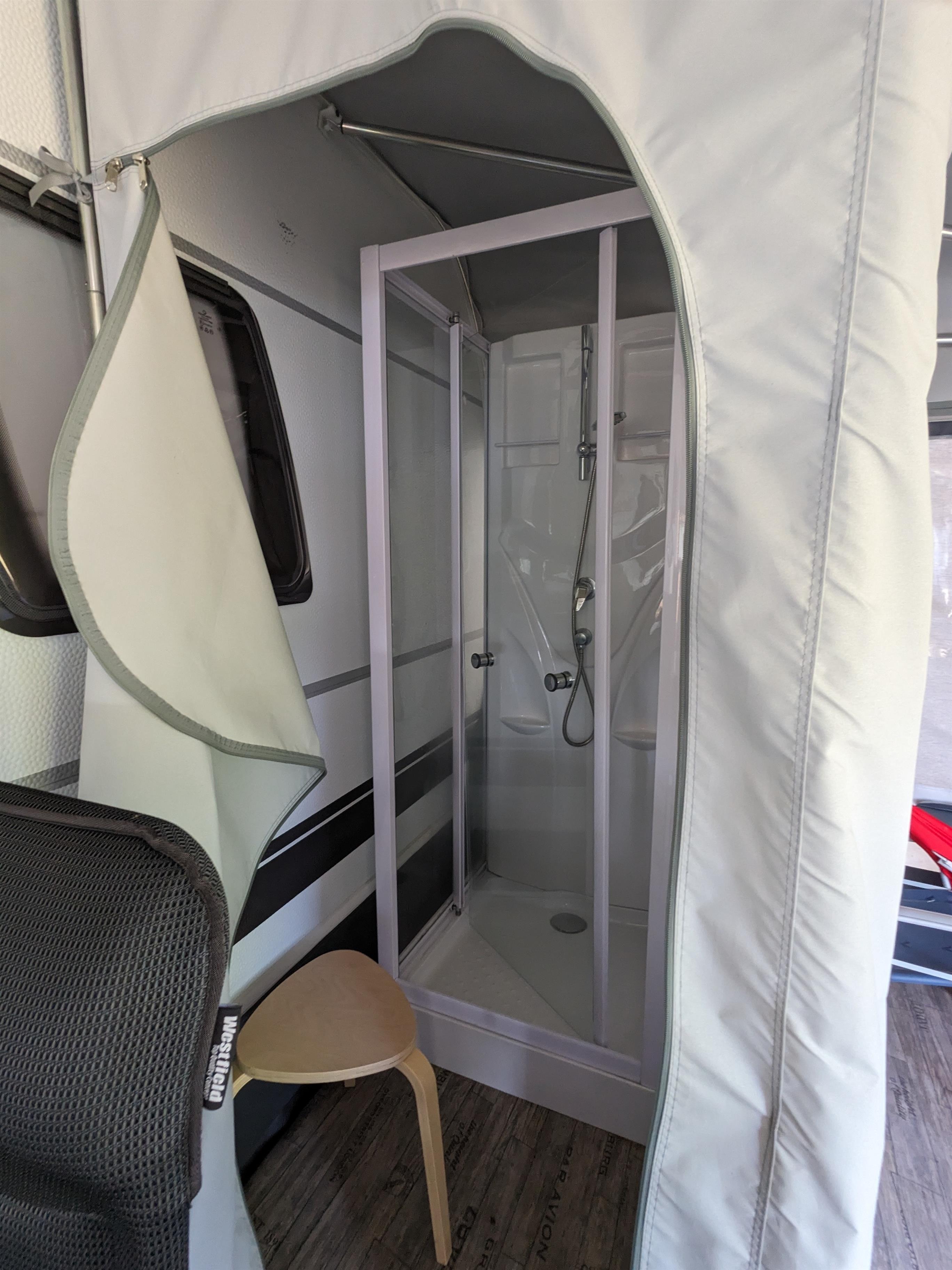Unsere Luxusmietwohnwagen sind mit einer Dusche und einer festen Toilette ausgestattet - mit direktem Anschluss an die Kanalisation. Dadurch muss nichts entleert werden. Er befindet sich direkt am See.