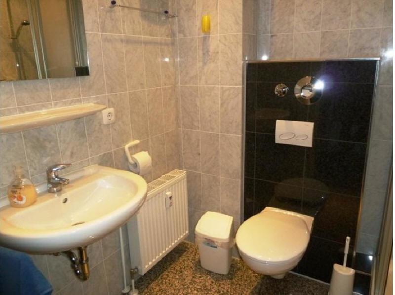 Modern eingerichtetes Bad mit Marmorfliesen. Schlaf- und Wohnzimmer ab März 2020 mit Vinylböden.