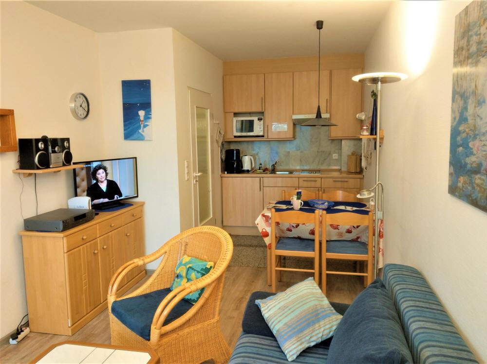 Wohnzimmer mit Essplatz, Schlafsofa.
