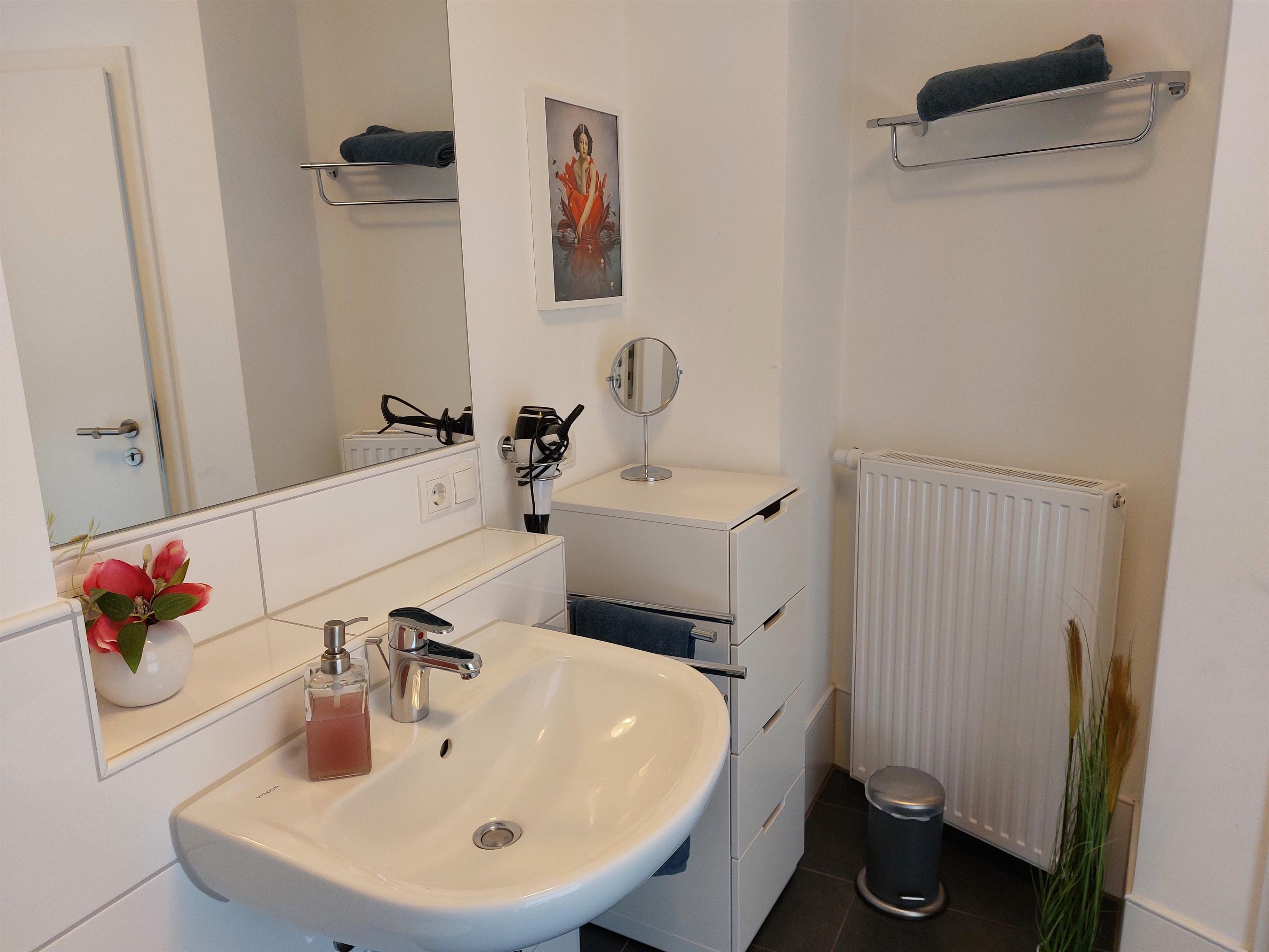 Das helle Badezimmer verfügt über eine bodengleiche Dusche. Nichtraucherwohnung. PKW-Stellplatz vorhanden.
