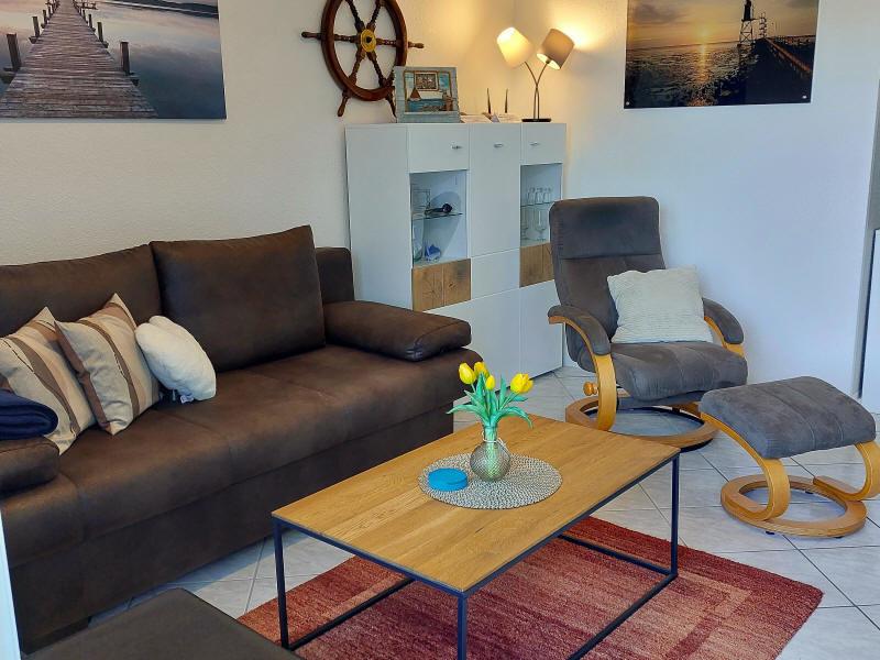 Geräumiges Wohnzimmer mit Essplatz, Schlafsofa. Komplett eingerichtete Küche mit Kühlschrank incl. Gefrierfach,