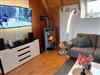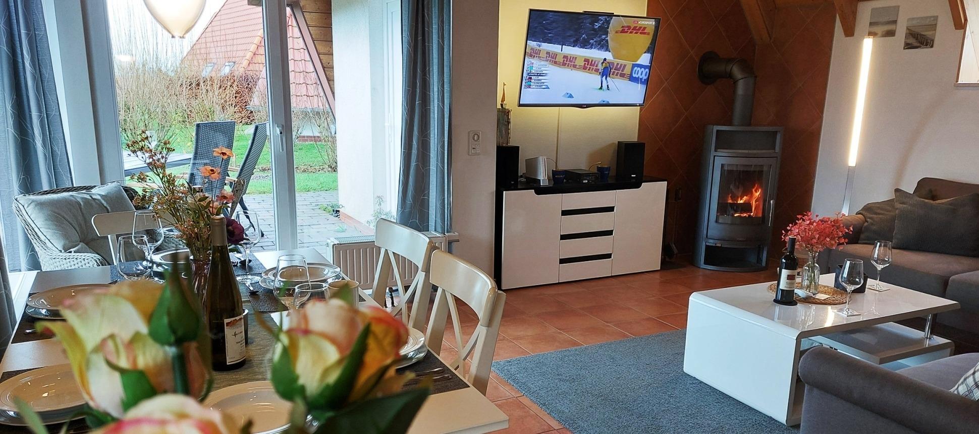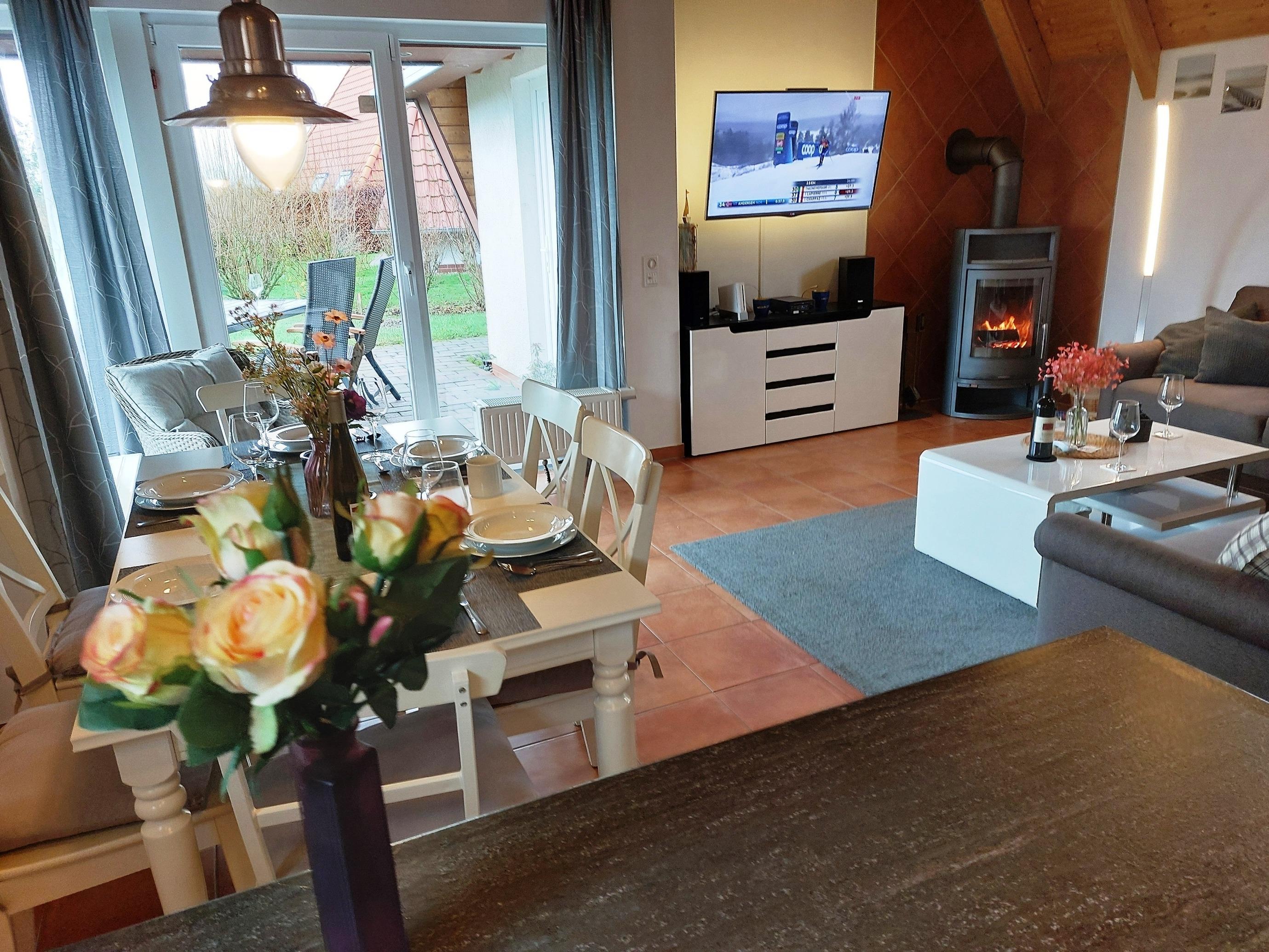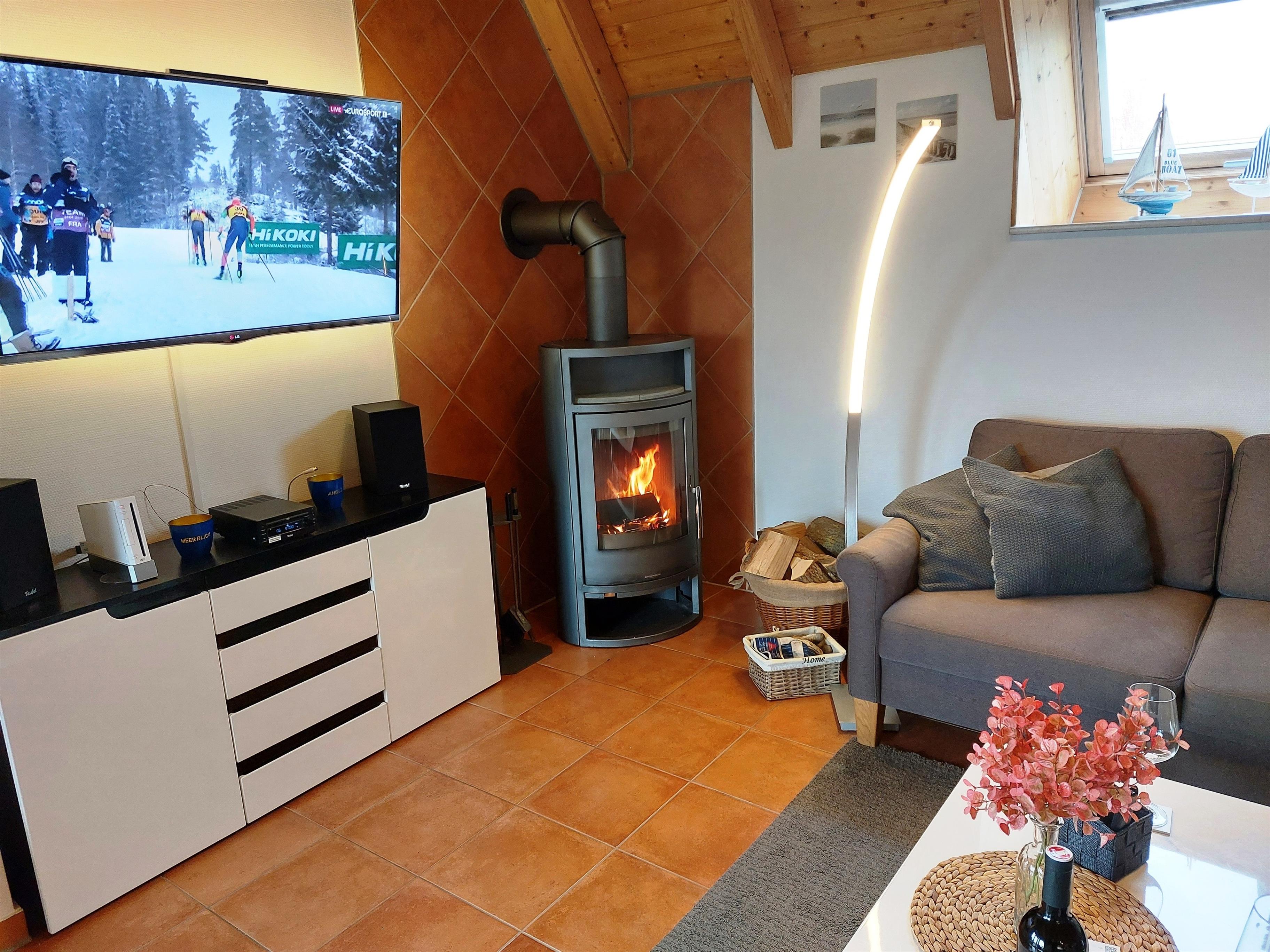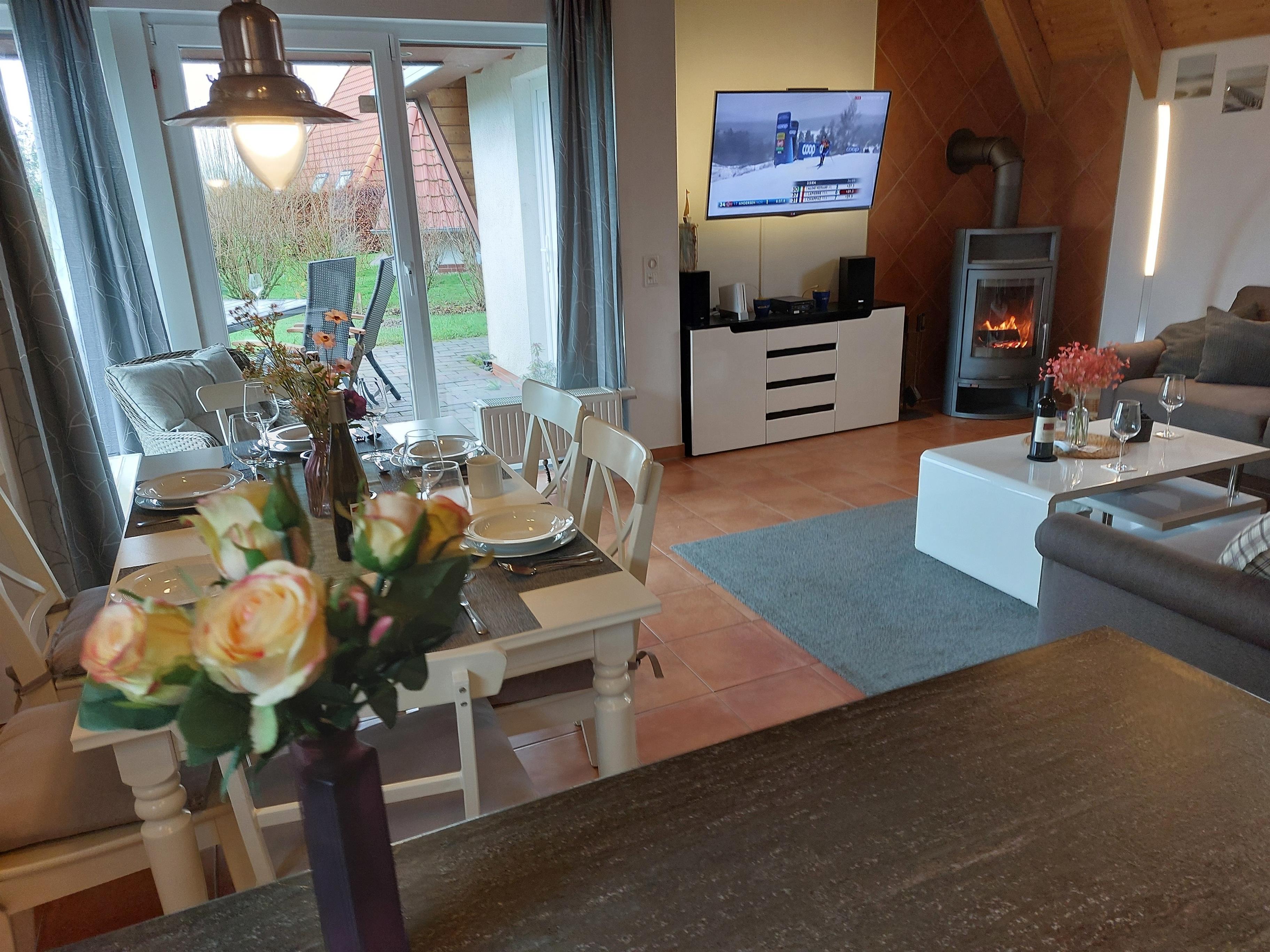 Im Erdgeschoss befindet ein Schlafzimmer mit Fernseher, ein Badezimmer mit Waschmaschine und der Wohn- und Essbereich mit Kaminofen und Fernseher mit DVD-Player sowie einer Musikanlage mit Bluetooth. Die Küche ist komplett eingerichtet/ausgestattet
