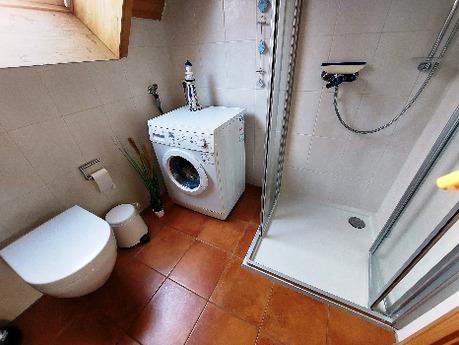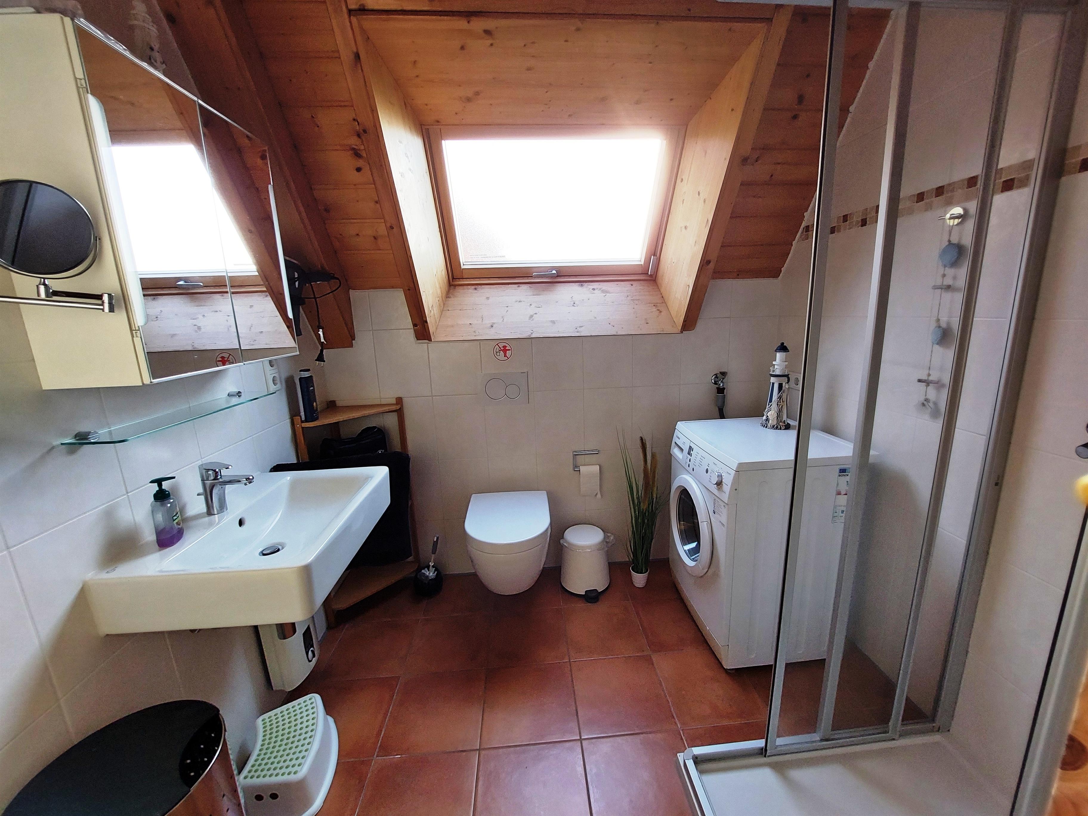 In dem Duschbad steht eine Waschmaschine zur kostenlosen Benutzung bereit.