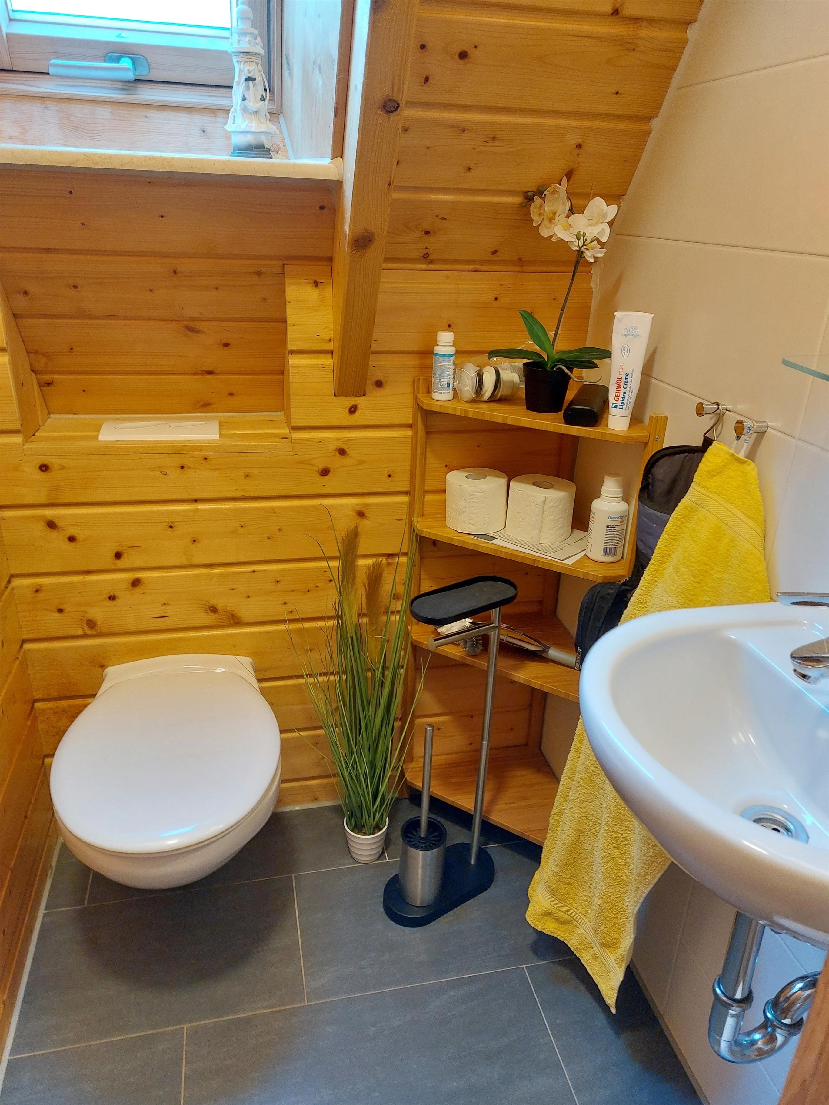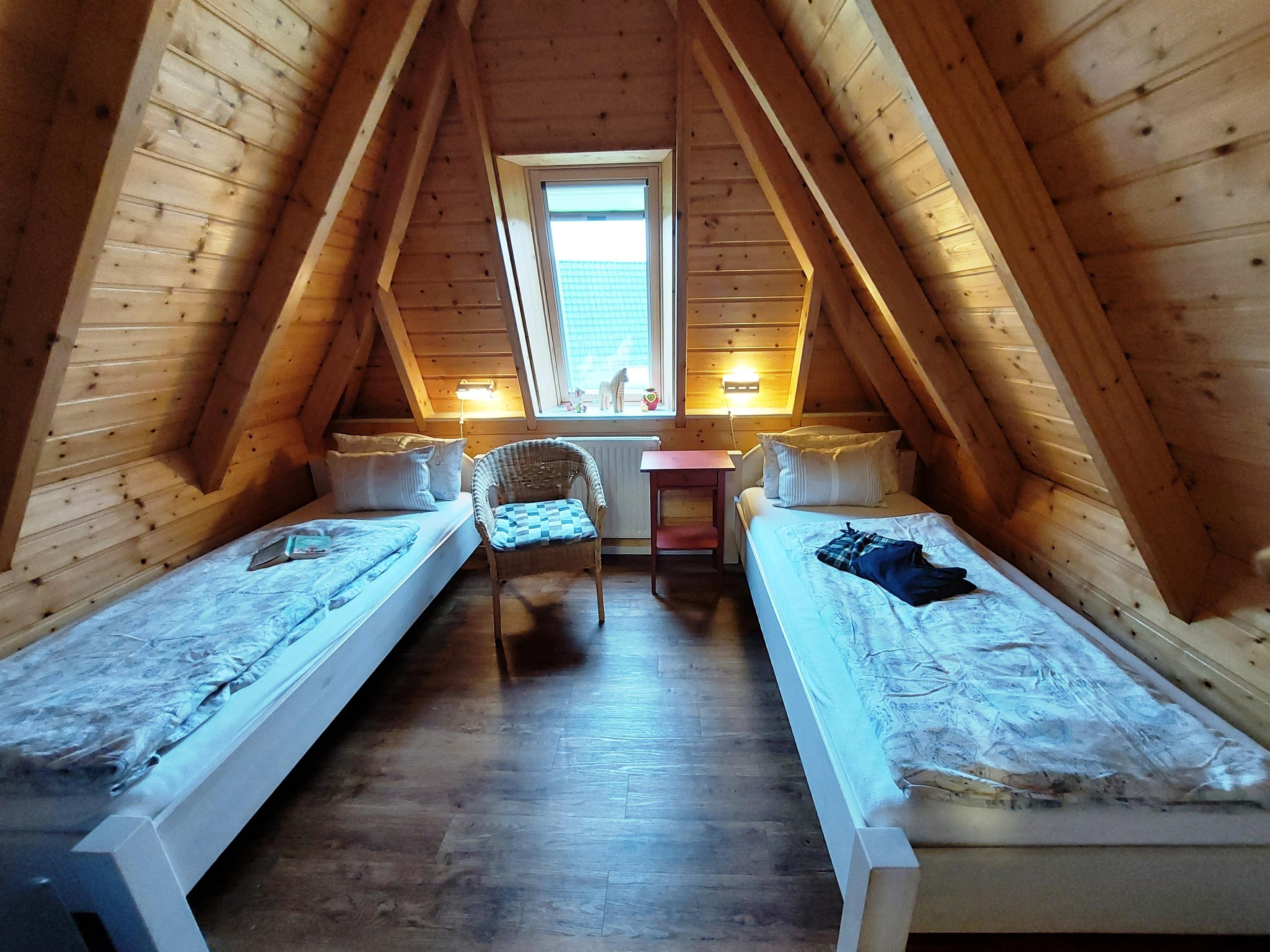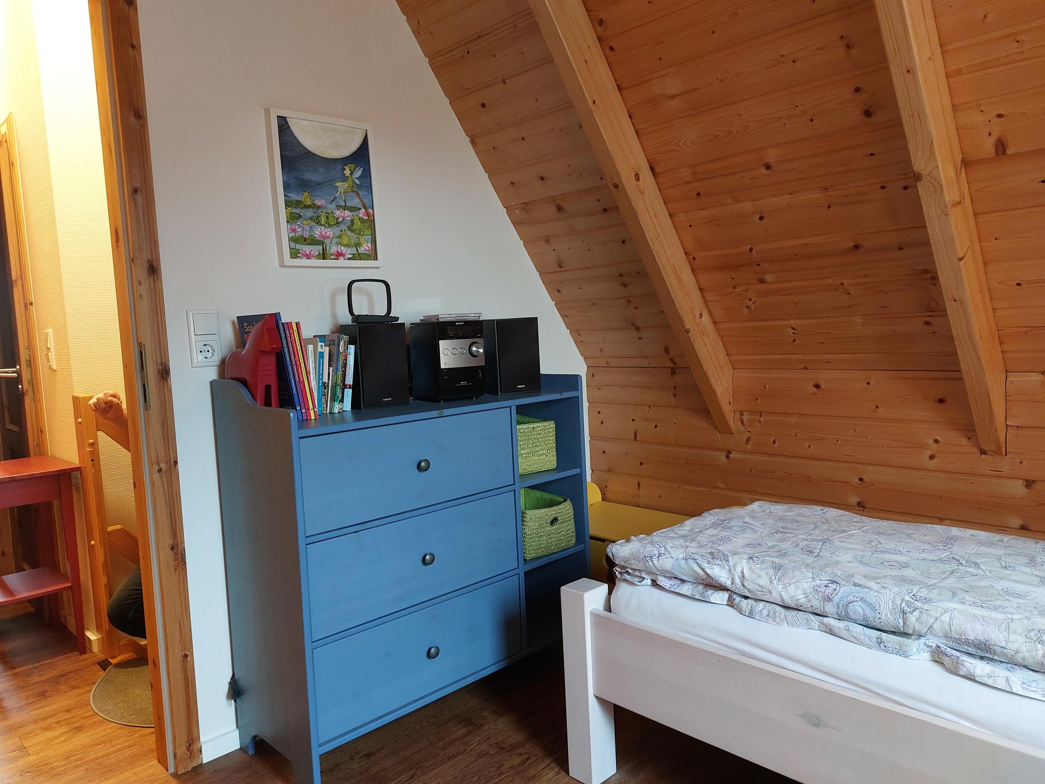 Im Obergeschoss befinden sich zwei weitere Schlafräume mit einem Doppelbett und zwei Einzelbetten, sowie das Gäste-WC. Für die Kindersicherheit sind zur Treppe nach oben Kindergitter oben und unten angebracht.