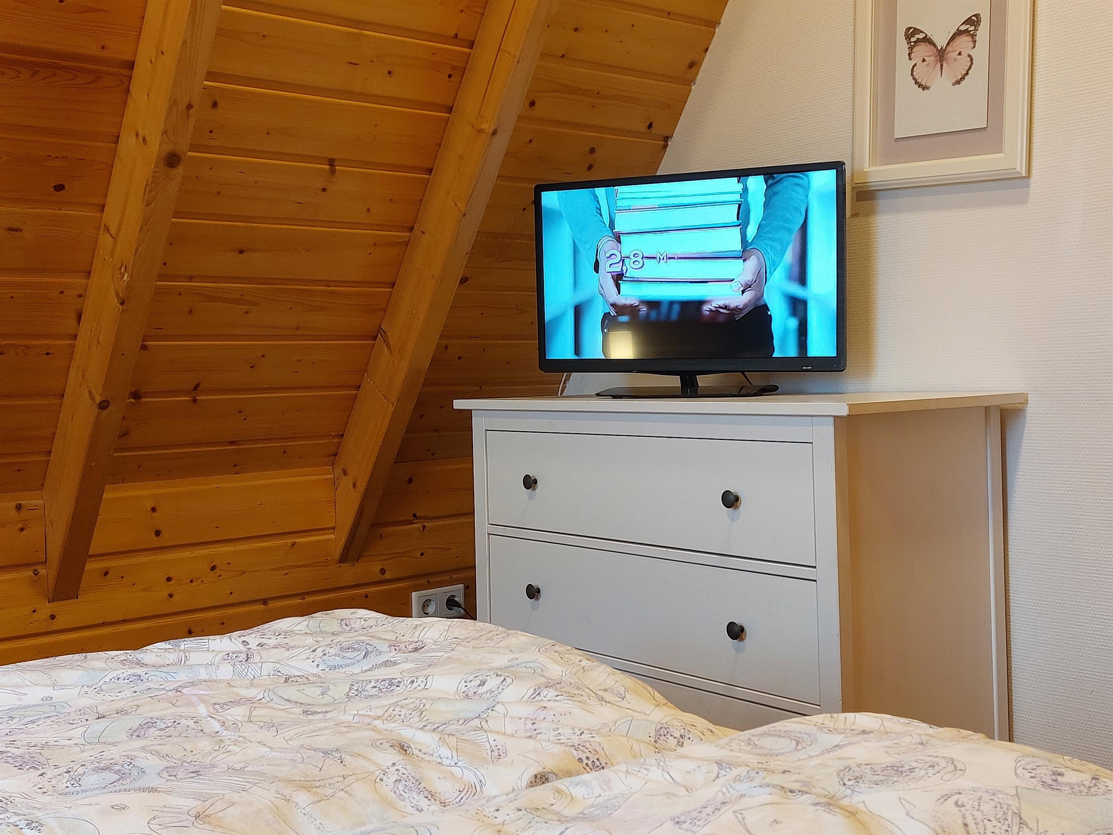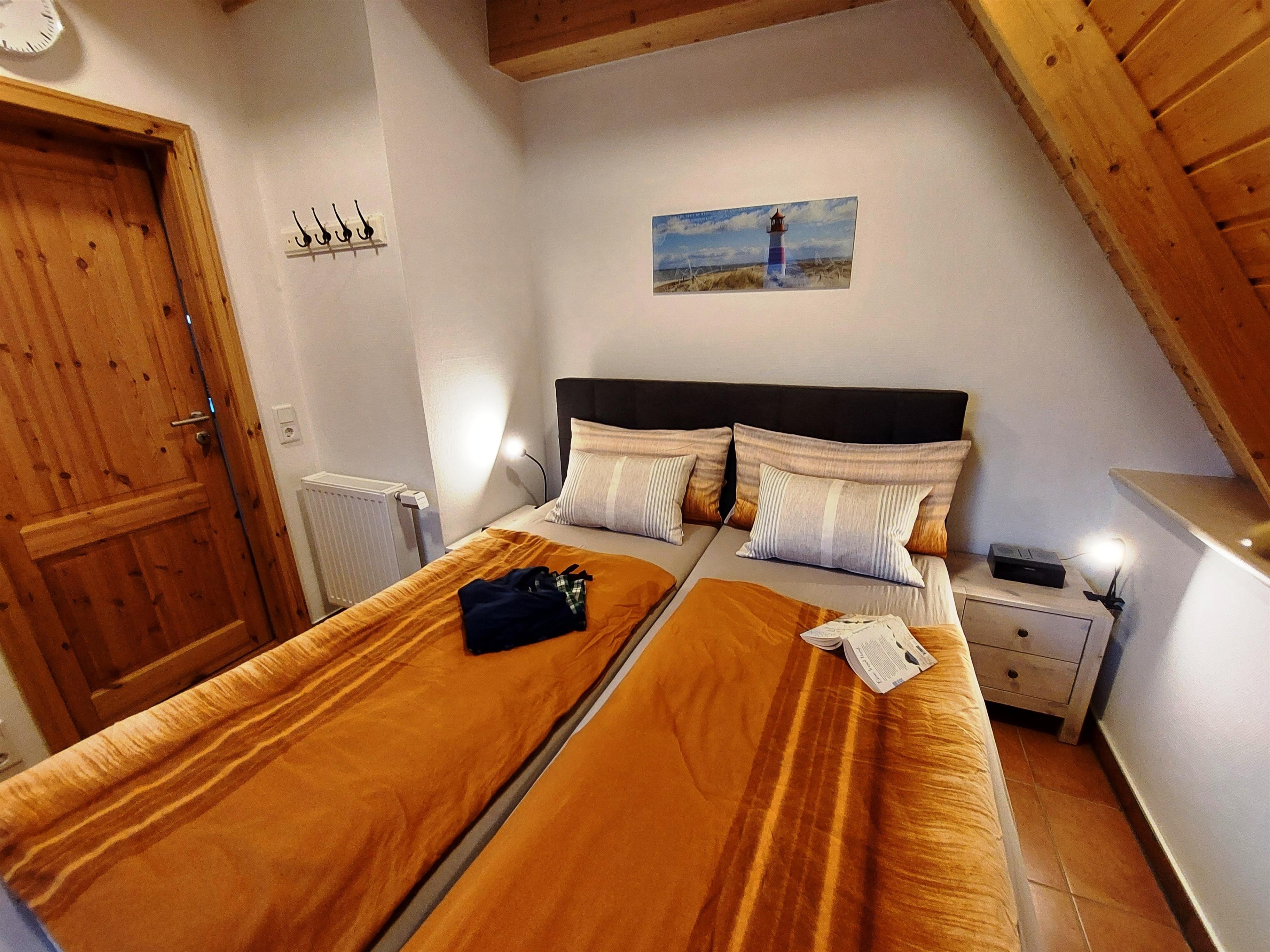 Im Obergeschoss befinden sich 2 weitere Schlafzimmer mit einem Doppelbett ( 160 x 200 cm mit 2 Einzelmatratzen) und TV, im 2. Schlafzimmer stehen 2 Einzelbetten ( 90x200 cm). Auch diese Zimmer sind mit Rollläden zur 100% Verdunkelung ausgestattet. Zusätzlich befindet sich ein weiteres WC mit Waschgelegenheit im Obergeschoss.