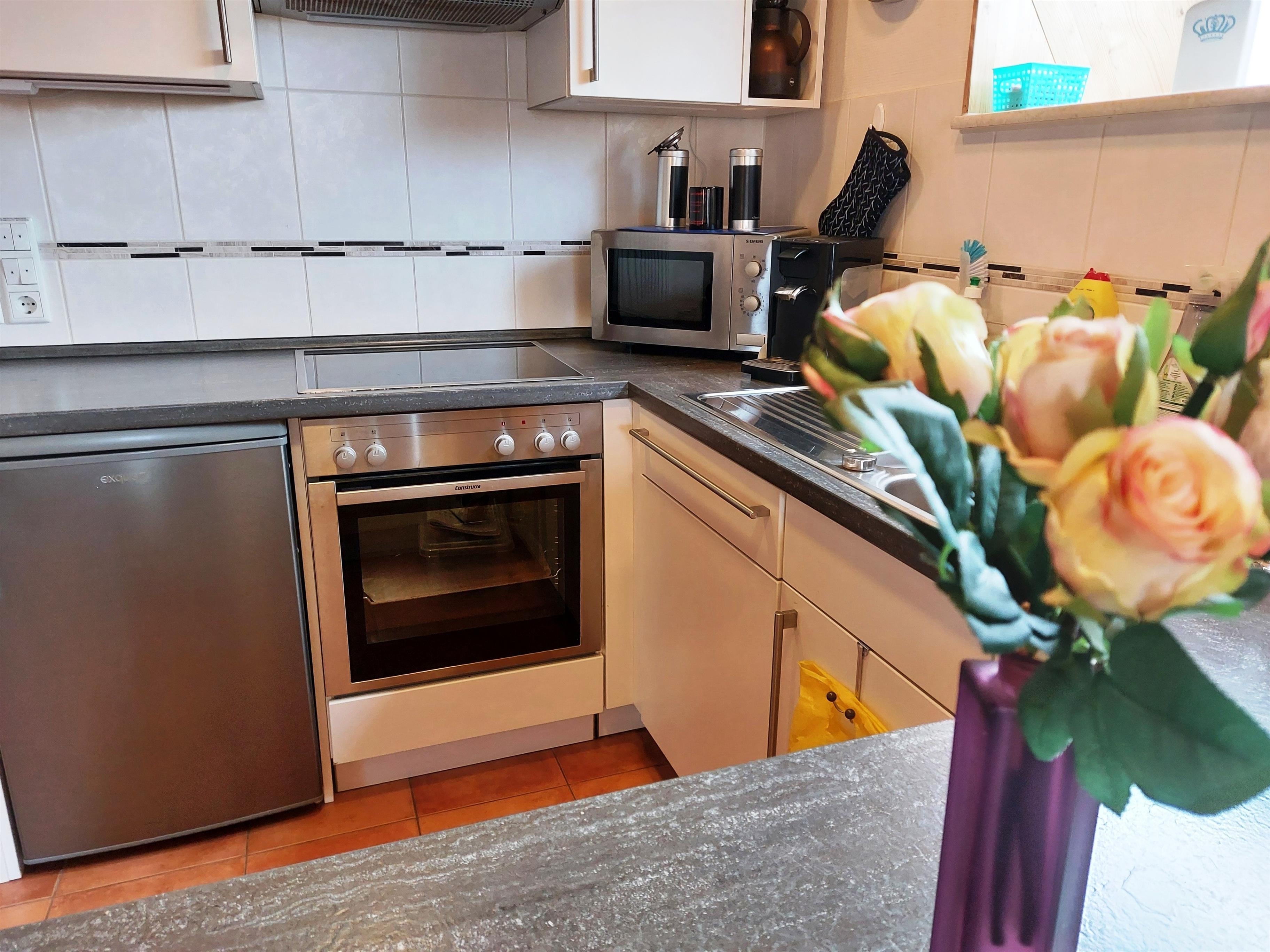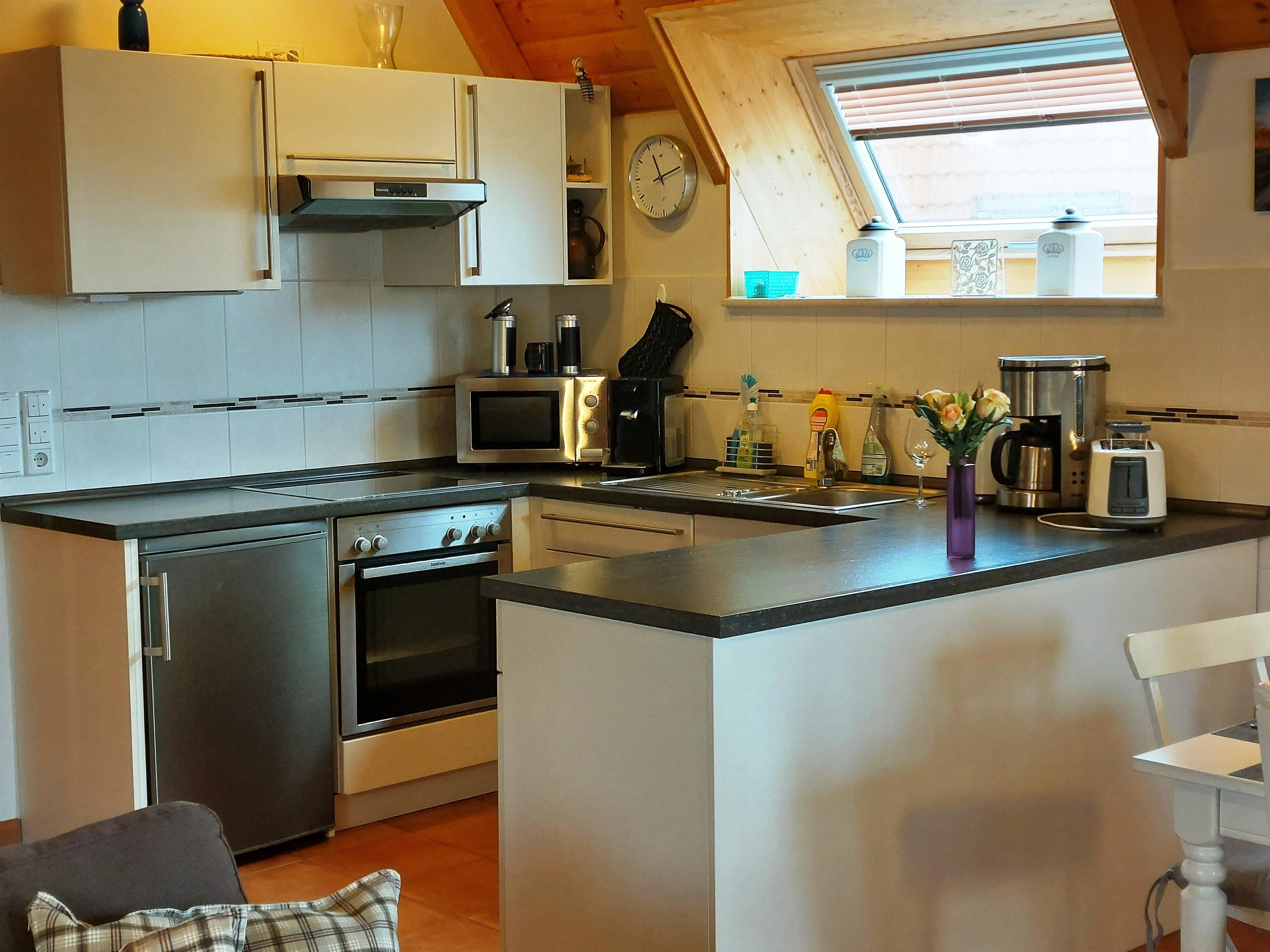 Backofen, Cerankochfeld /4 Platten, Geschirrspüler, Kühlschrank mit Gefrierfach. Mikrowelle, Eierkocher, Filter-Kaffeemaschine und Senseo Kaffeepadmaschine, Wasserkocher, Mixer, Toaster, Geschirr und Besteck - und vieles mehr...